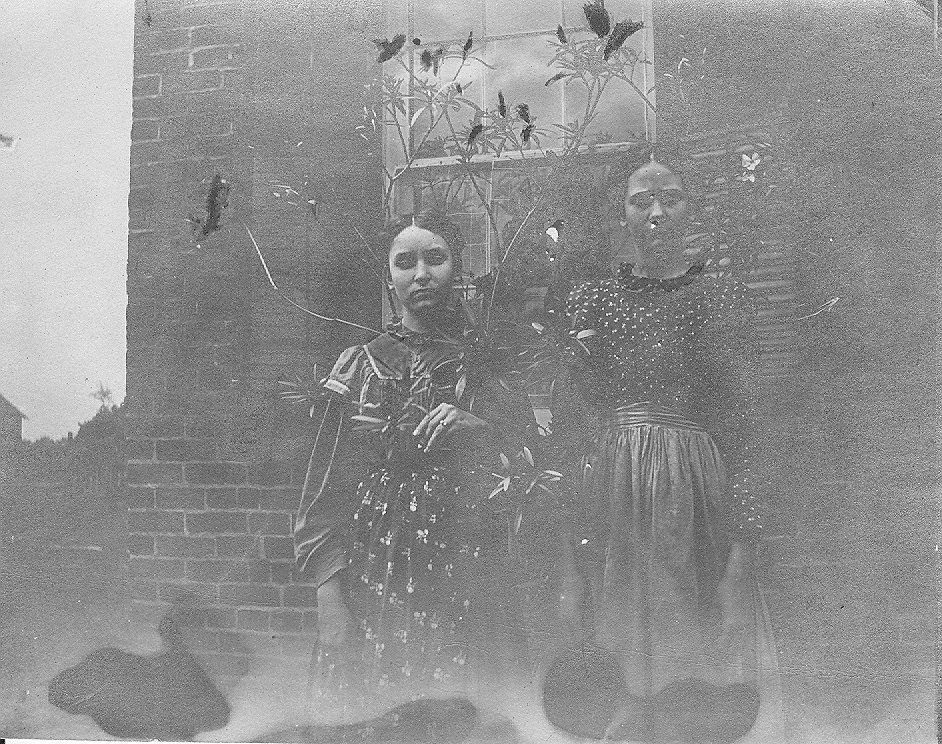 3.75" x 5" black and white glossy photo in landscape format. Image shows two young women standing in front of a brick building and window amidst a flowering bush. The woman on the left is shorter and wears a dark shirt with a floral skirt. The woman on the right wears a small, floral print shirt with a dark skirt. Both women wear their hair parted in the middle and pulled back. They are identified on the back of the photo as Minnie and Nonie Fisher.Collection