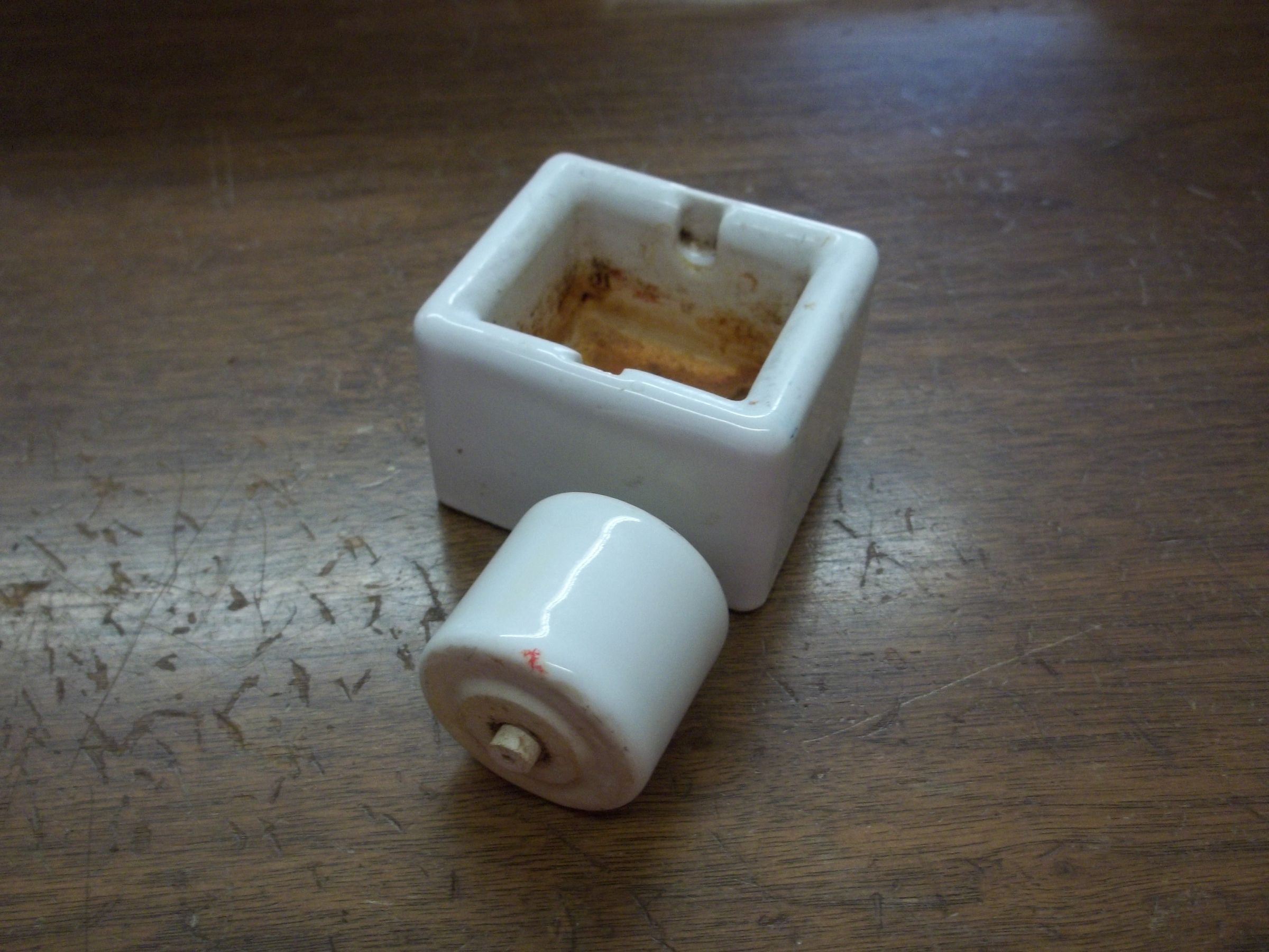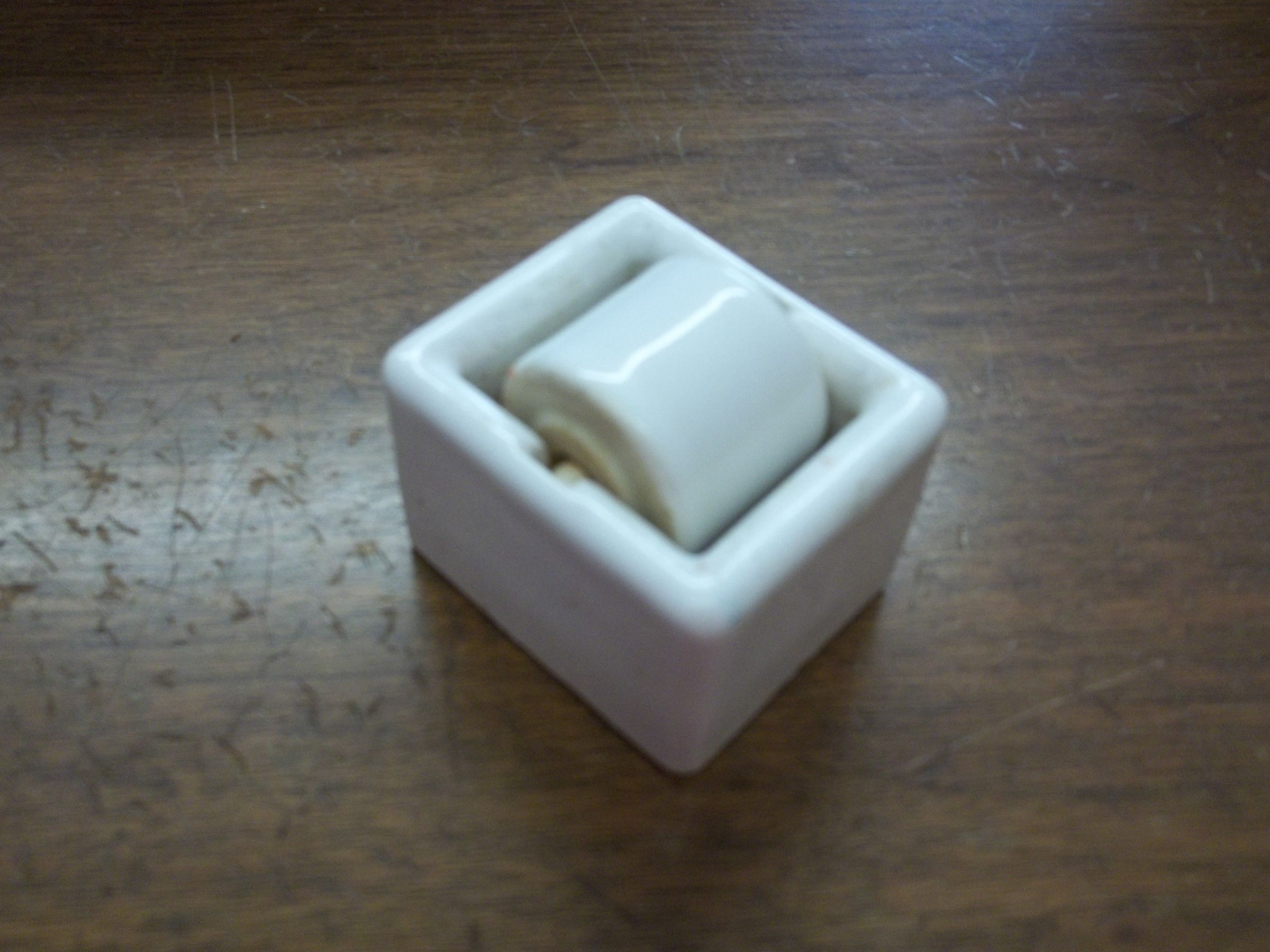 Among the clerical objects from the Fountaintown Tuesday Club. A postage stamp moistener comprised of a rectangular holder with a cyllindrical roller that is suspended by a rod that passes through the middle of the cylindar and rests in niches cut out of the sides of the holder. Water would be placed in the bottom of the holder, and when the roller was spun, it would moisten postage stamps to be applied to letters.Collection