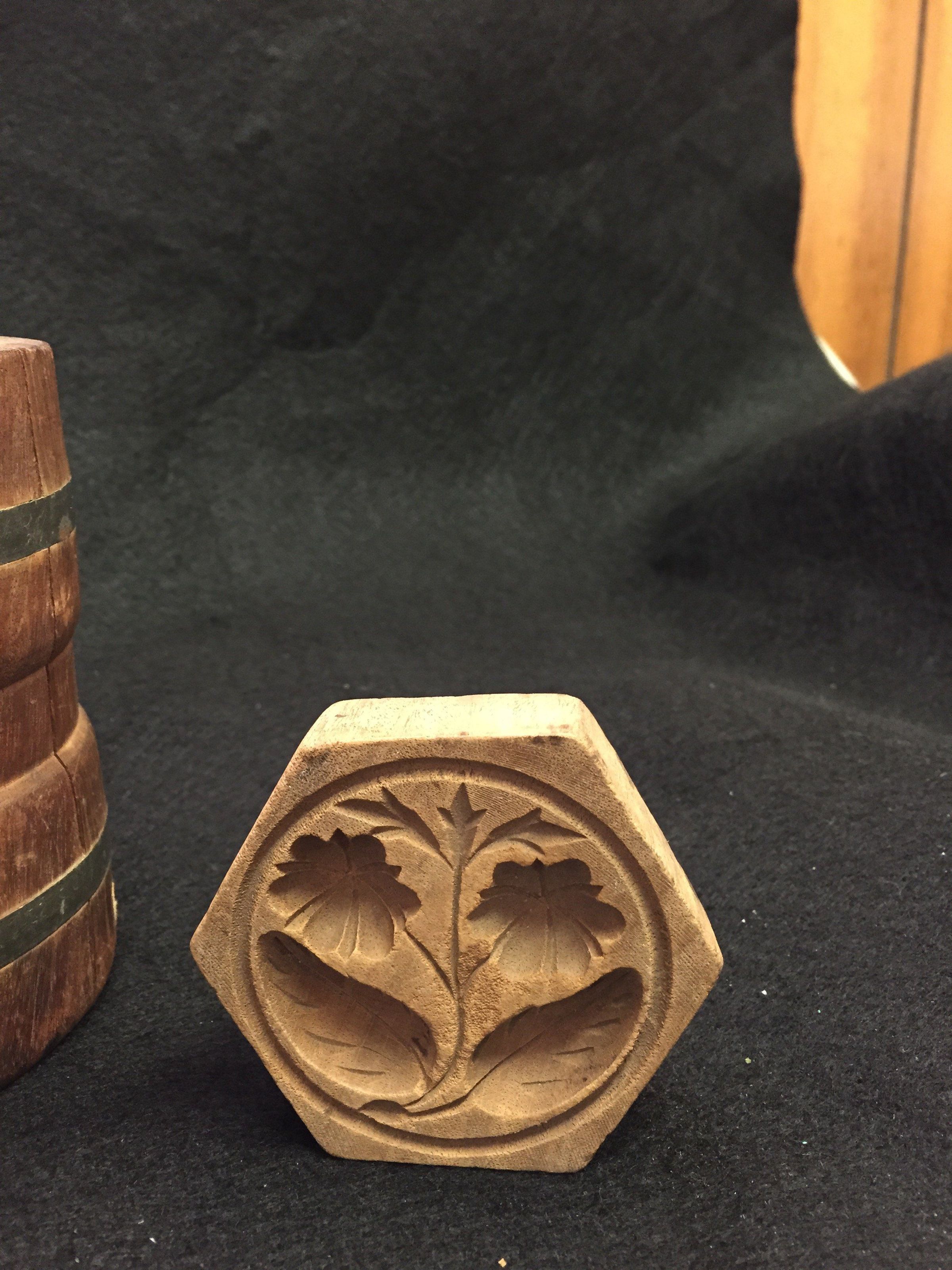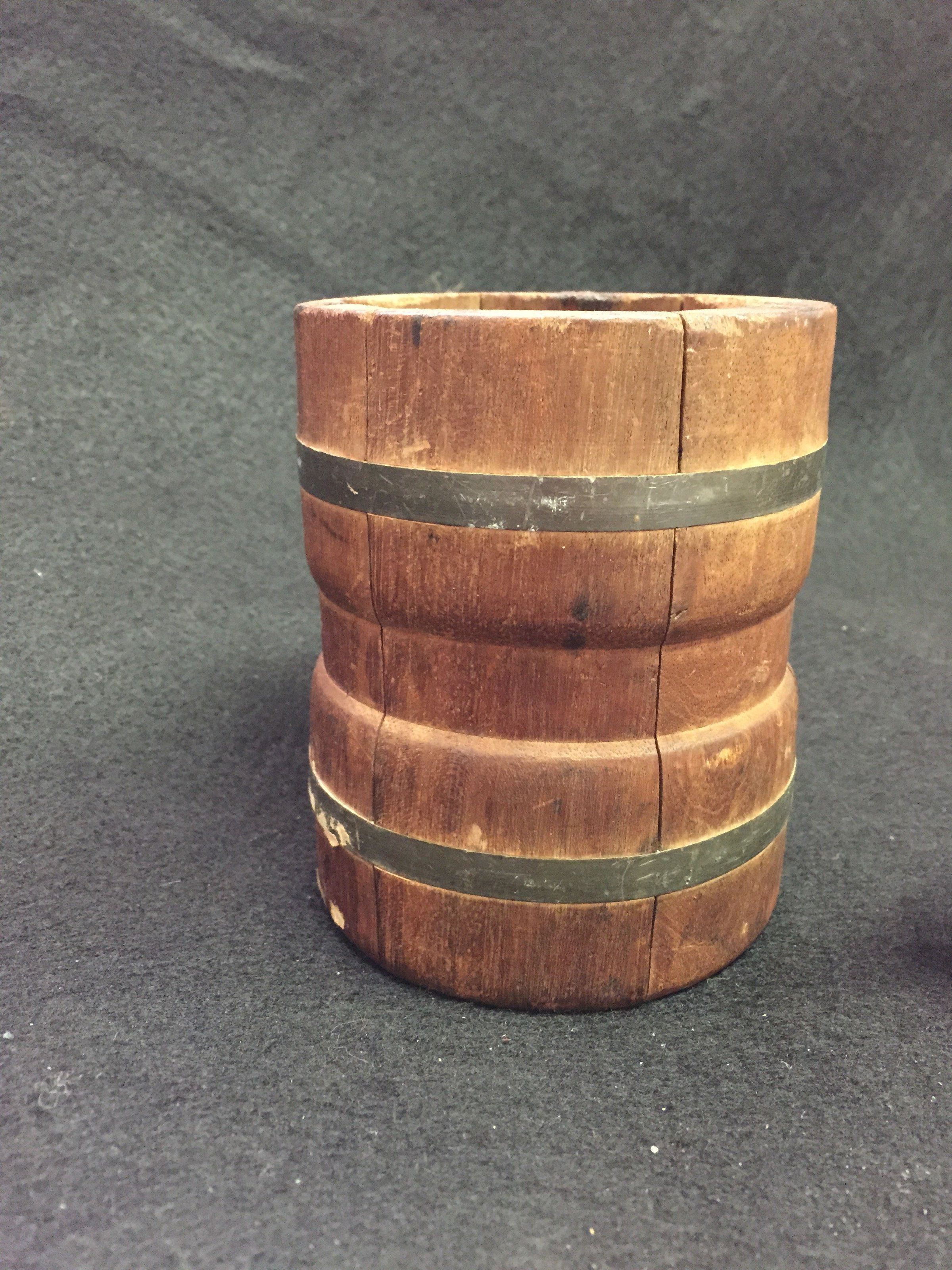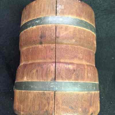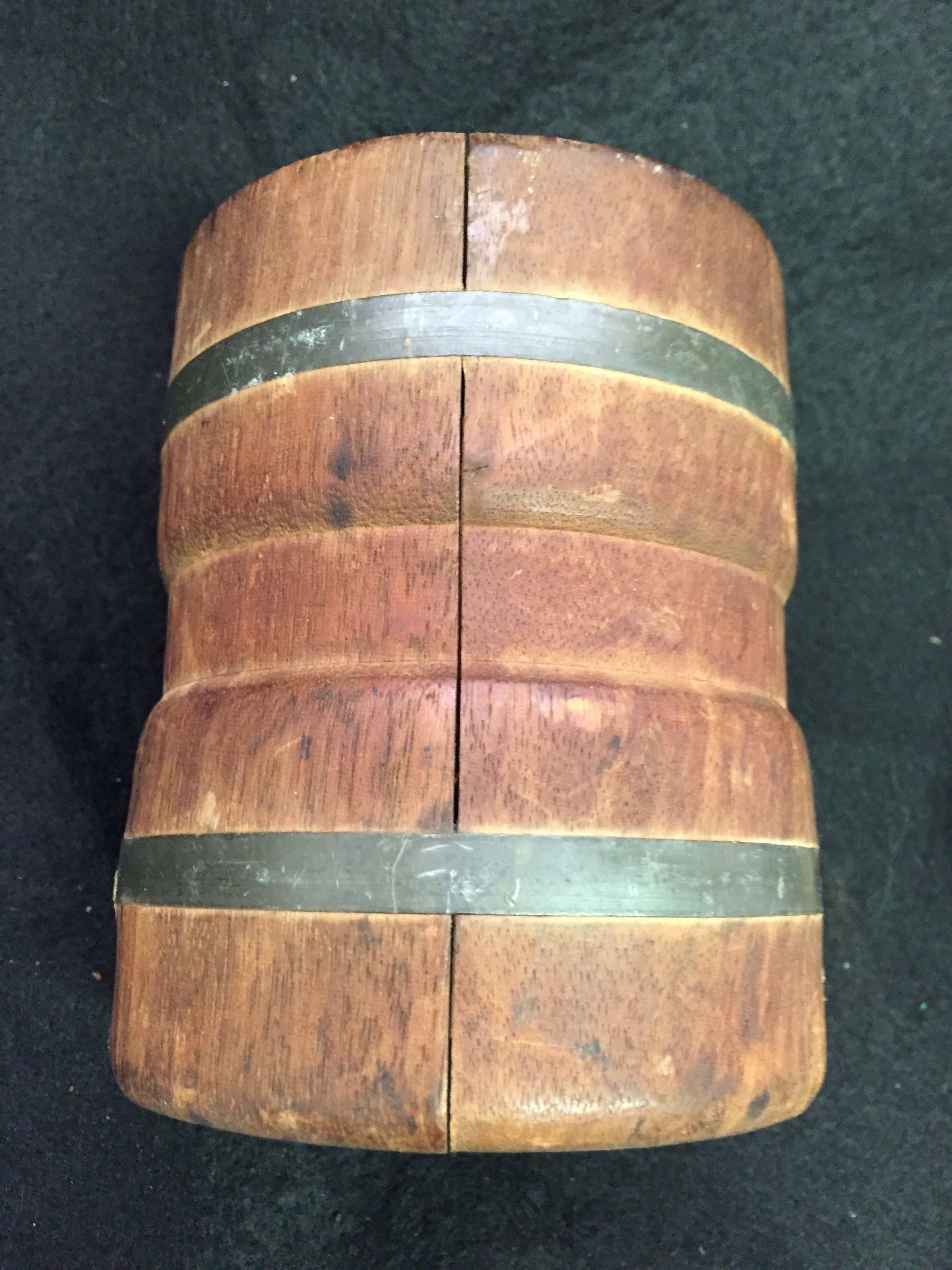 A: butter mold in the shape and construction of a barrel. Outside is round but interior is a six-sided shape. Barrel is made in six sections held together with two metal bands. There is space between each section due to drying of the wood. Three screws are seen on the base of the barrel but no reason for them.