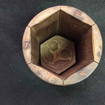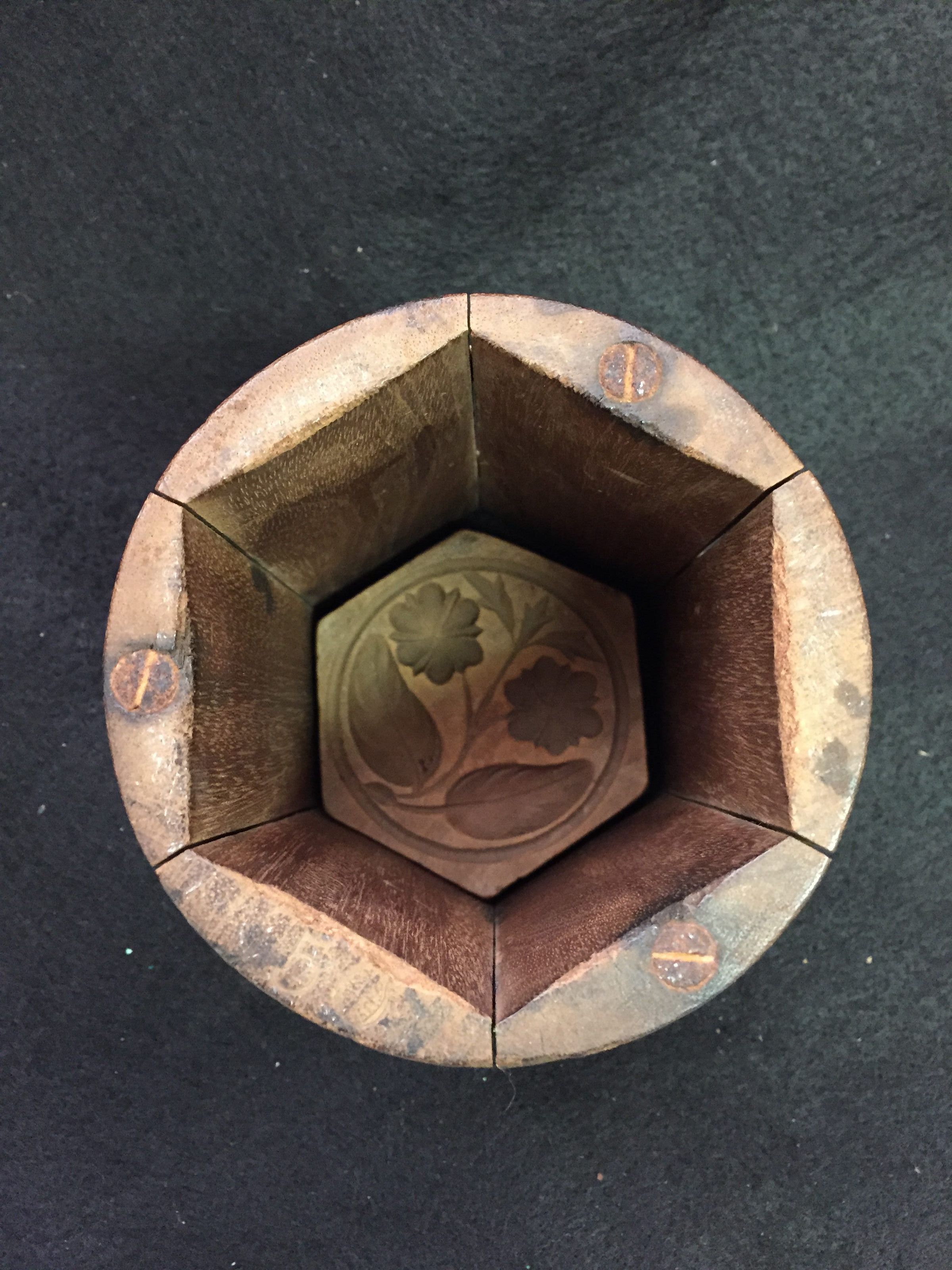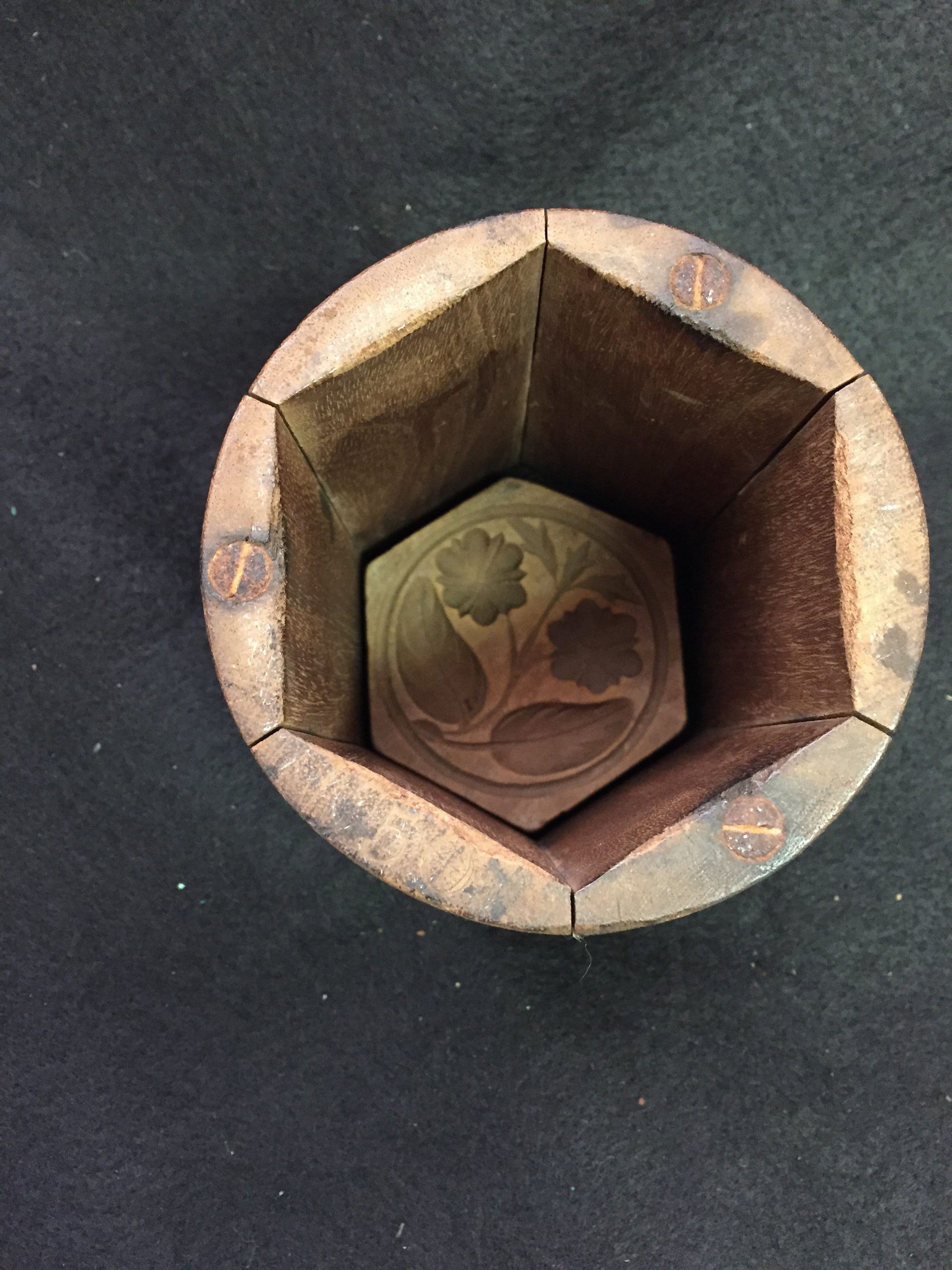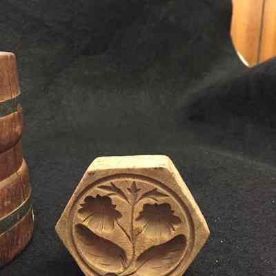 A: butter mold in the shape and construction of a barrel. Outside is round but interior is a six-sided shape. Barrel is made in six sections held together with two metal bands. There is space between each section due to drying of the wood. Three screws are seen on the base of the barrel but no reason for them.