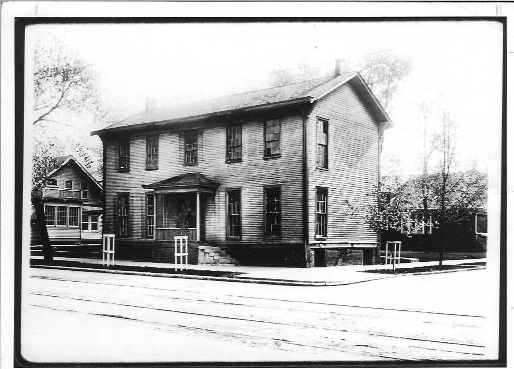 Donation, 07/26/2005. Black and white glossy photographic print in landscape format. Image is of a two-story clapboard house with long, multi-paned windows, covered entrance and a brick foundation on corner lot. On back in ink: "The Morrison House in 1924 just before/it was torn down. The step and small/walk on the Mechanic St. side led to the long/porch not visible in the photograph."Collection