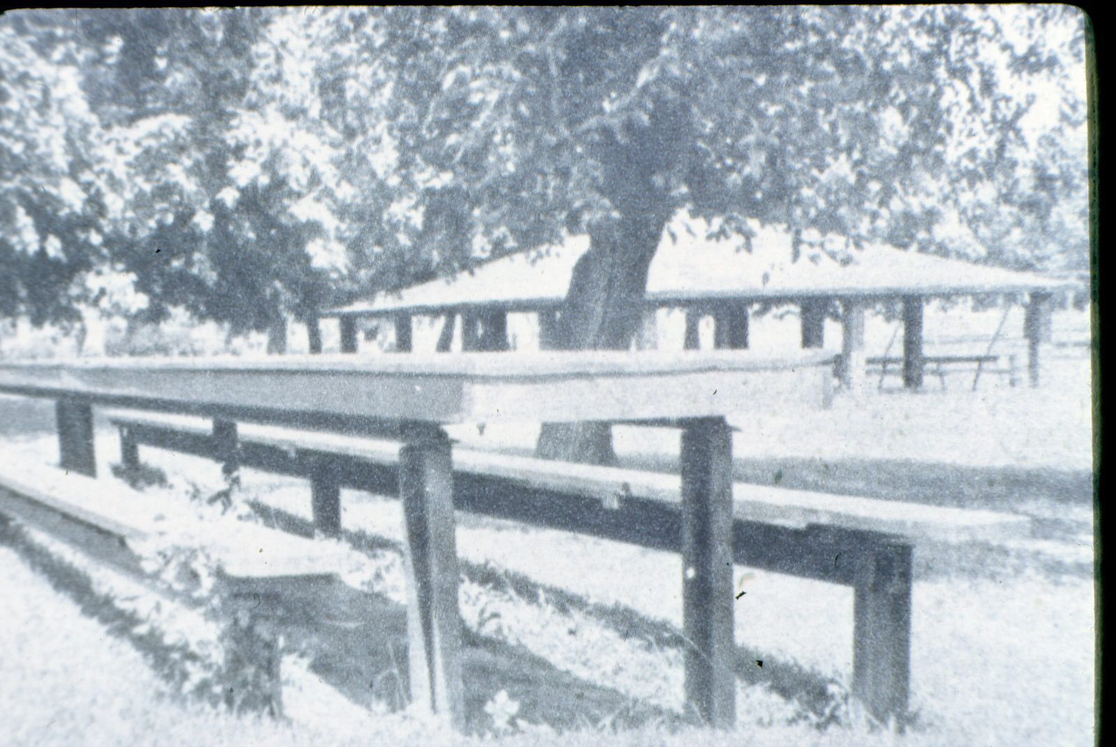 Black & white; copystand of dot printed image; Morrison Park in Shelbyville; foreground dominated by picnic table made from interurban rails; roofed pavillion in background.