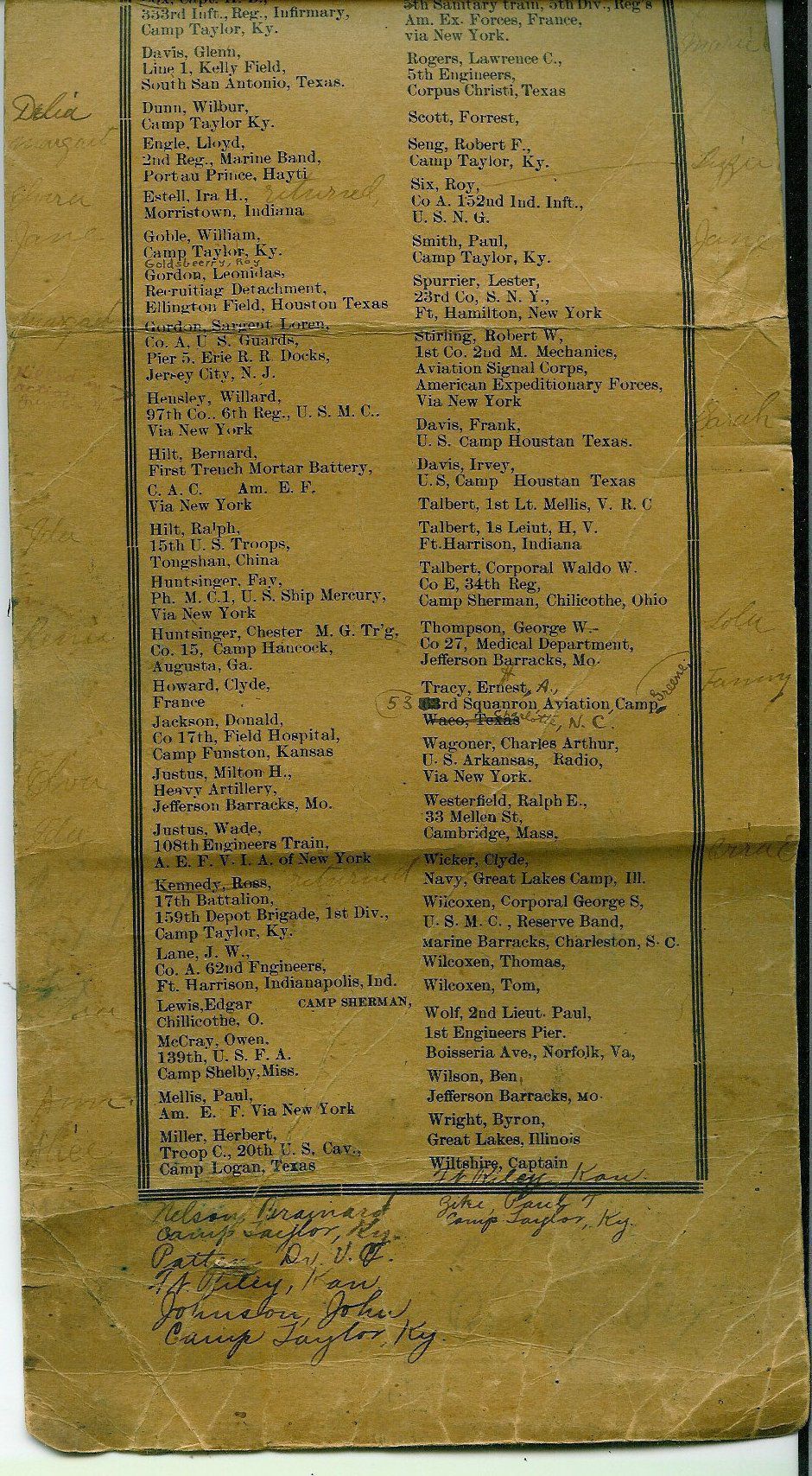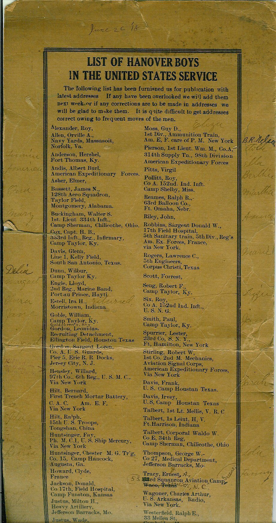Donation, 05/2004. Long narrow list, discolored with age. A roster of Hanover Boys in Service/World War I, Shelby County, Morristown, Indiana.Collection