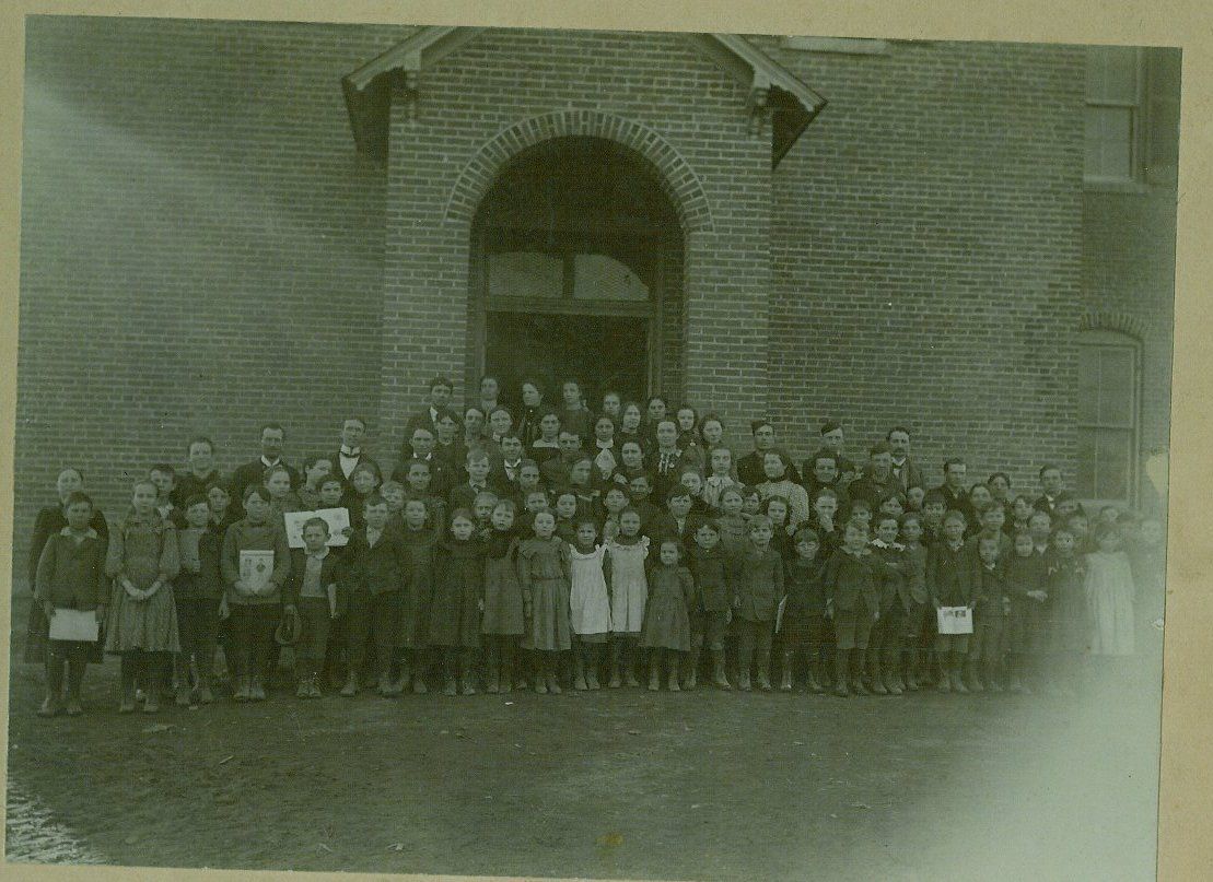Sepia photographic print in landscape format. Image is of a brick school house with an arched entrance and long windows. Faculty and students posed in front. On back of mount in black ink: "Old Morristown School." Donation, 1993.Collection