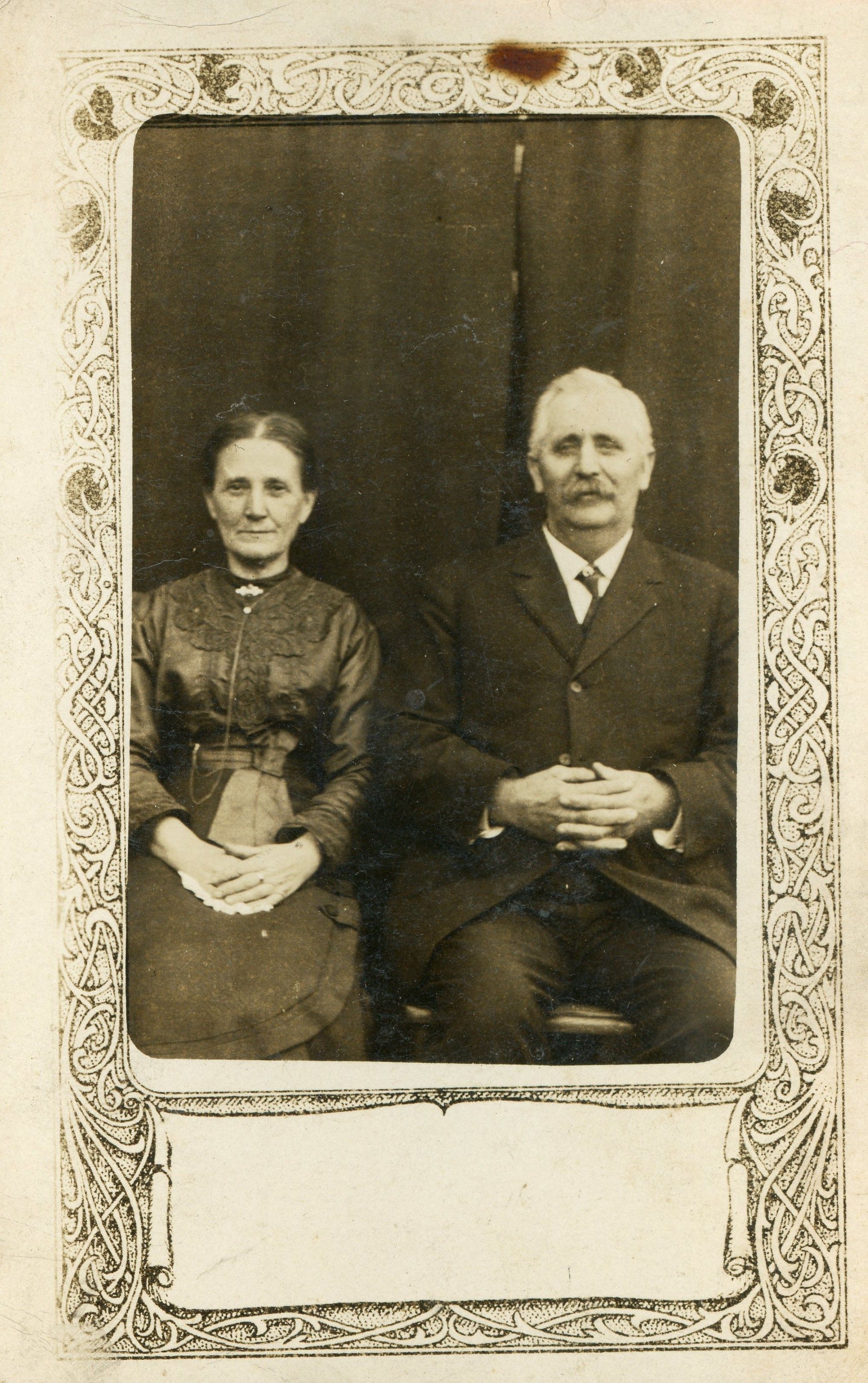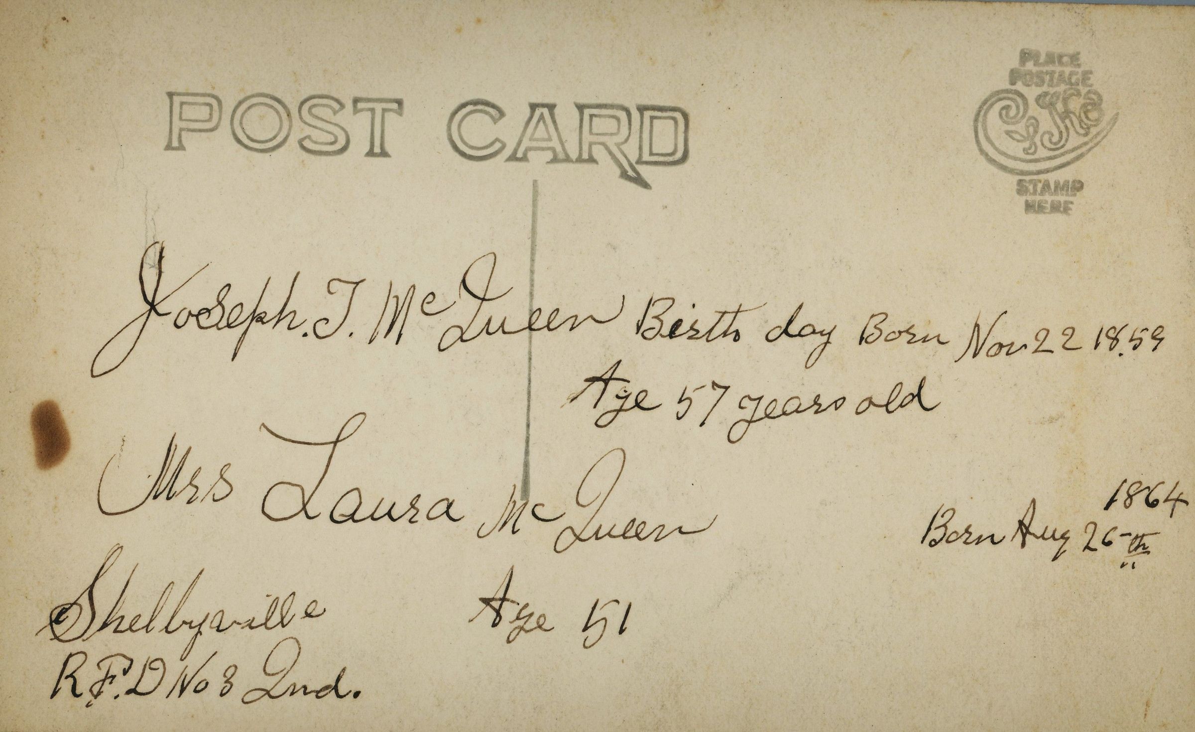 Postcard - Joseph T McQueen - Born Nov 22,1859 age 57 years old and Mrs Laura McQueen - Born Aug 26, 1864 age 51 years old. Shelbyville RFD No. 8 Ind.Acquisition