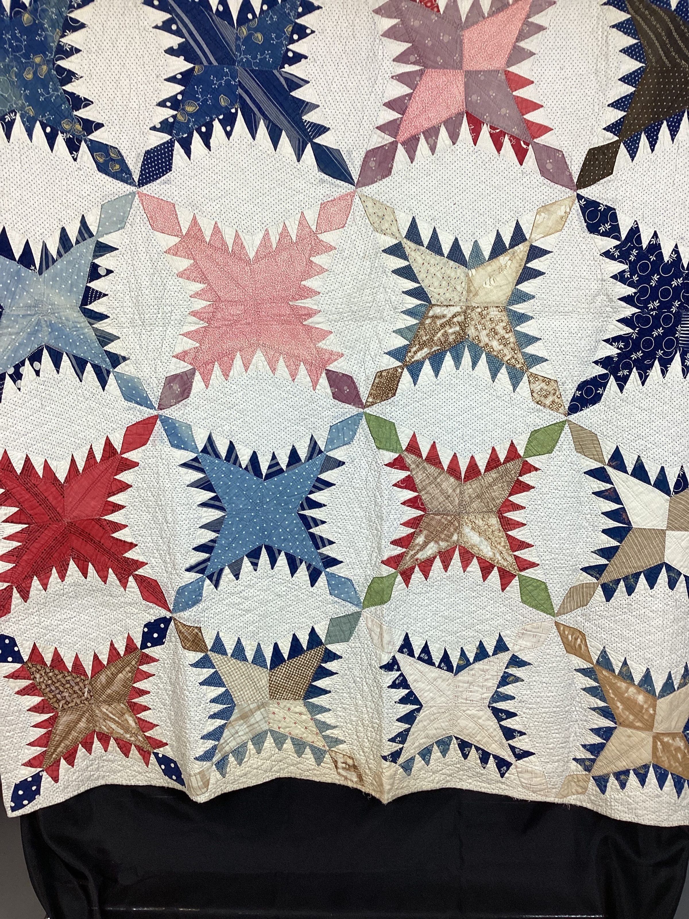 Pieced quilt; a variety of patterned fabric used; sort of a feathered star pattern; 5 rows long and each row consists of 4 feathered stars; between the stars is a white fabric printed with small blue stars, this fabric also used for the border; predominate color is blue in various shades, but reds, greens, brown, and yellow also visible; backing is plain white fabric.Context