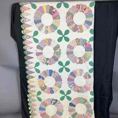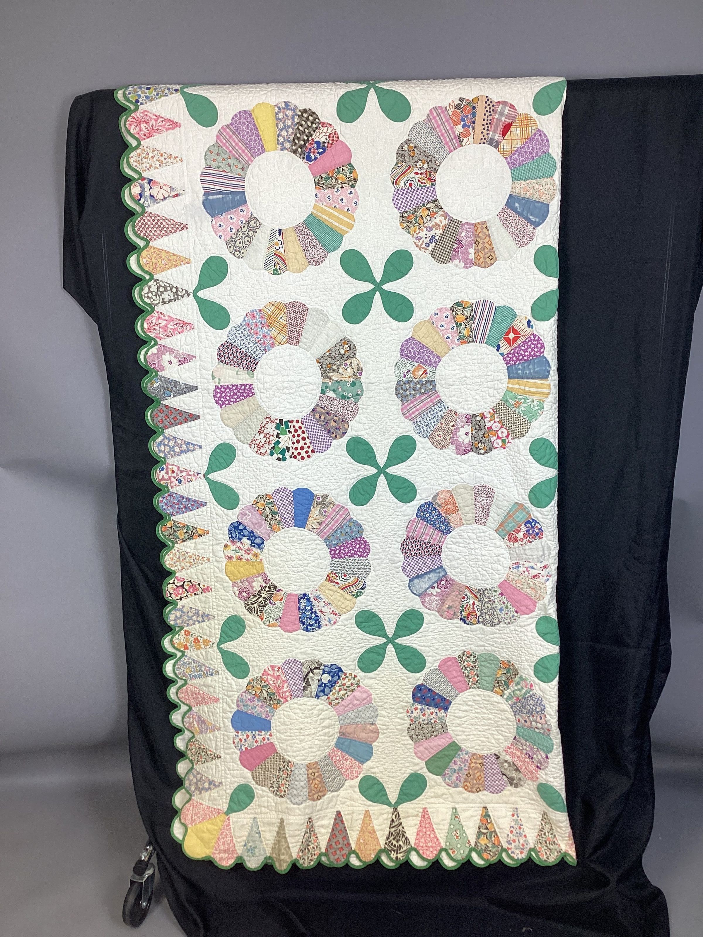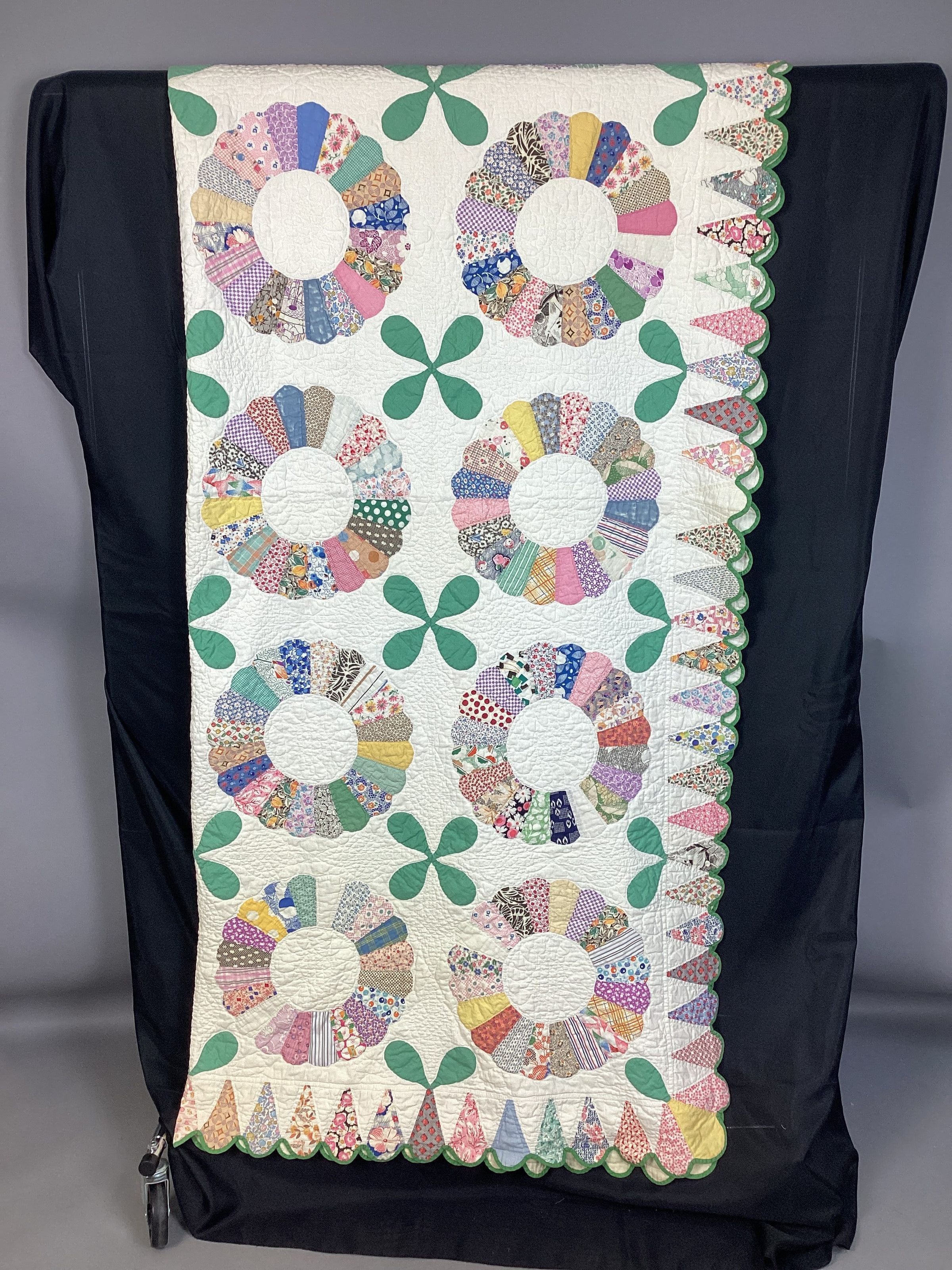 A multicolor floral patchwork quilt with green scalloped edging, made from feed sack fabrics. The quilt is hand-pieced and hand-quilted with sewn-on binding. The quilt is a variation of the Dresden Plate pattern.Acquisition