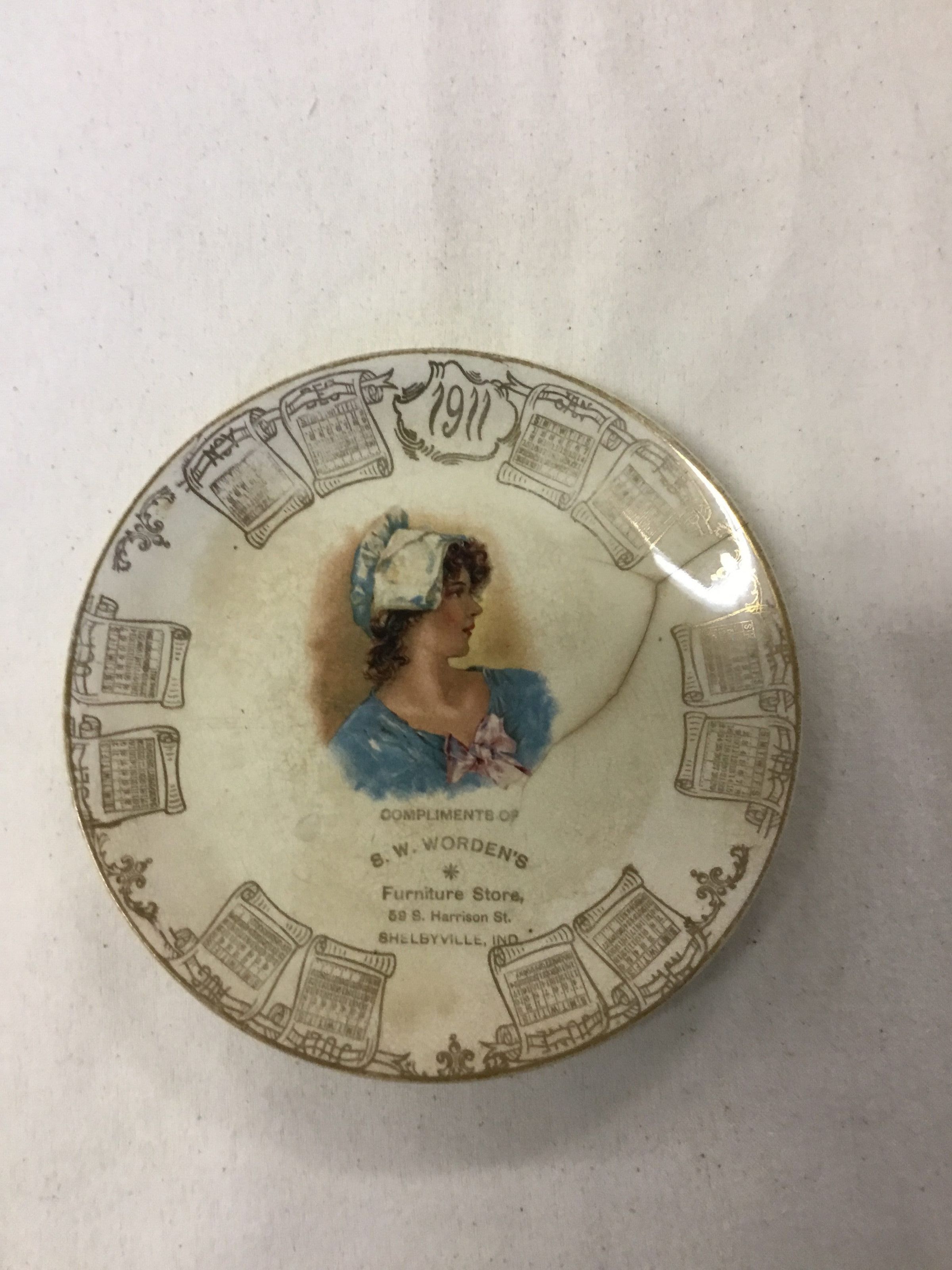 This plate was used as an advertising item by S. W. Worden's Furniture Store in Shelbyville, IN. The store was located at 59 S. Harrison St.Collection