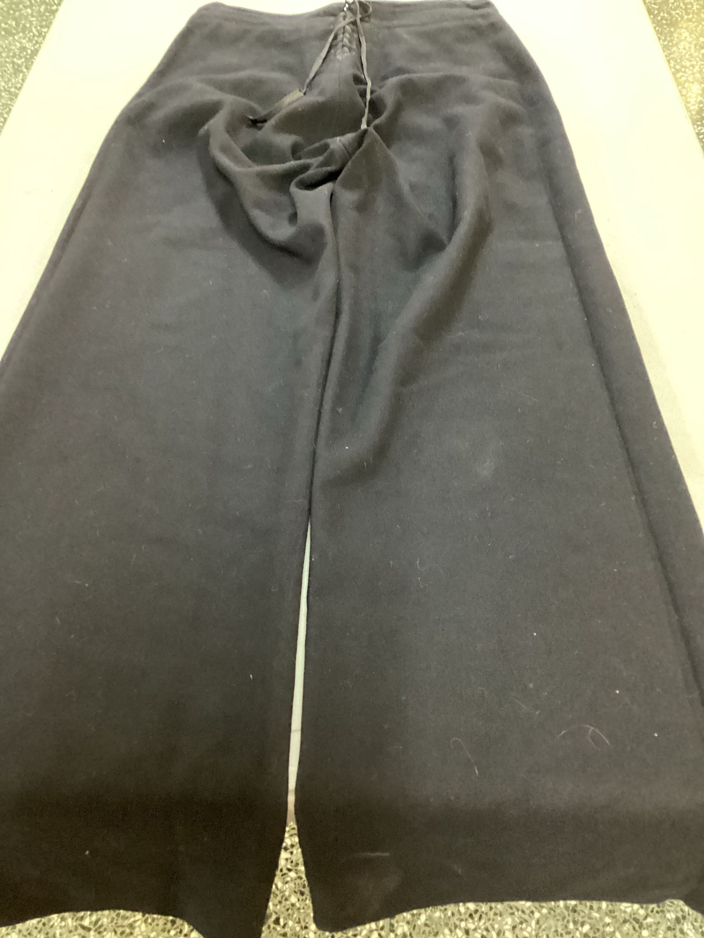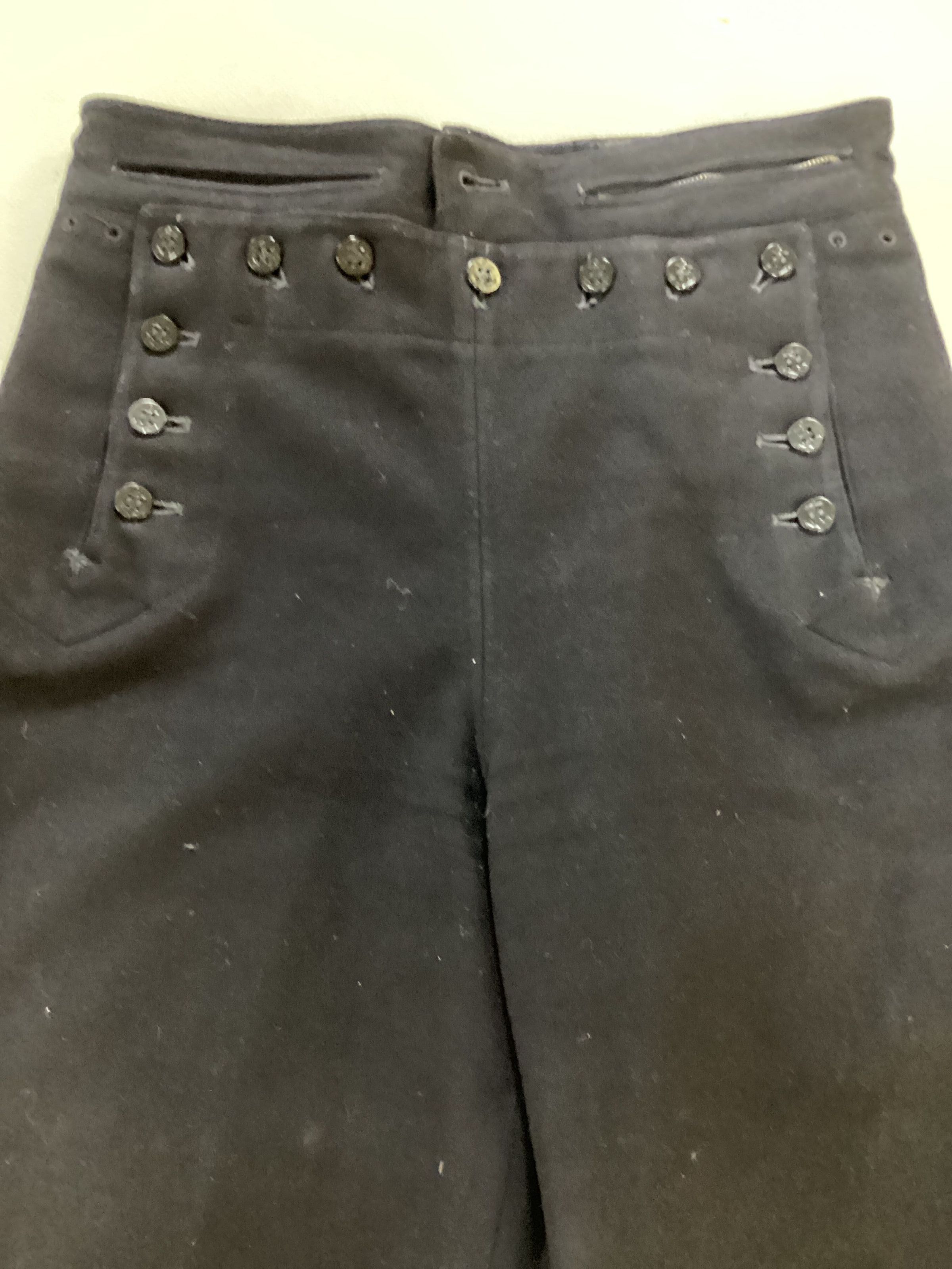 Black wool pants, naval uniform with laced front and buttoned back. The back flap is buttoned with 13 black buttons and then 2 buttons are at waistline. There are 2 shallow pockets on each side of these buttons. The one one right has a zipper closure.Use