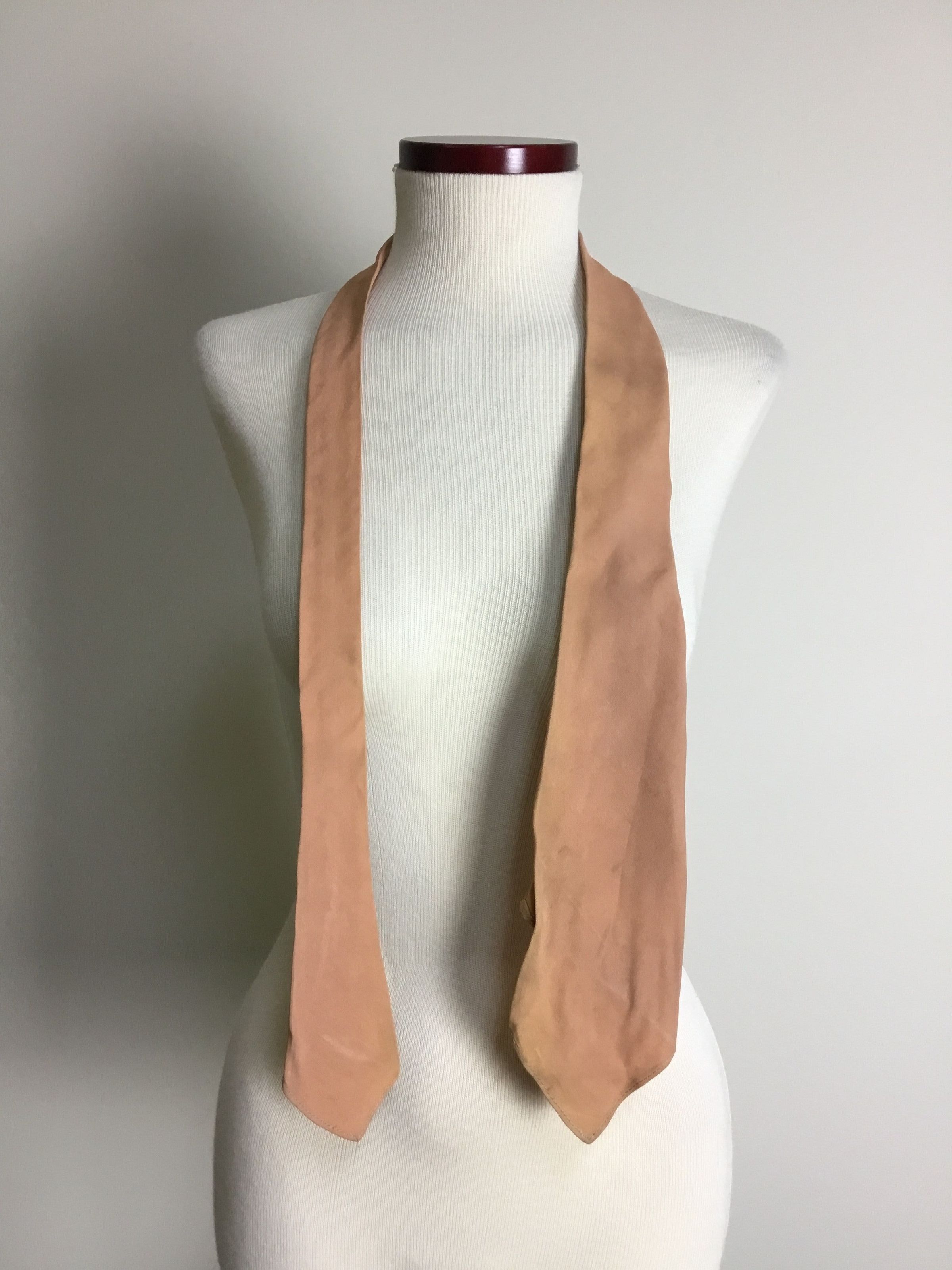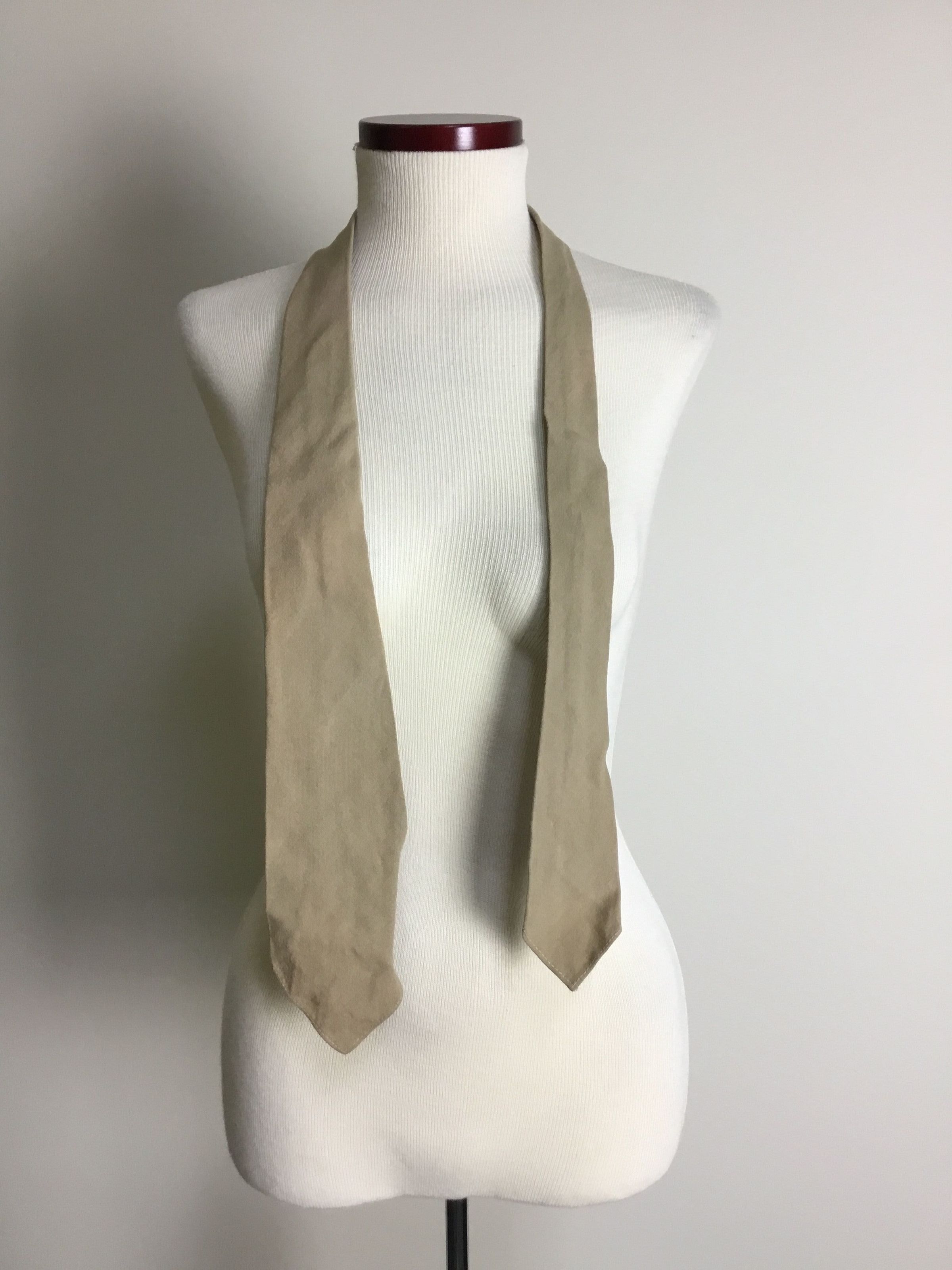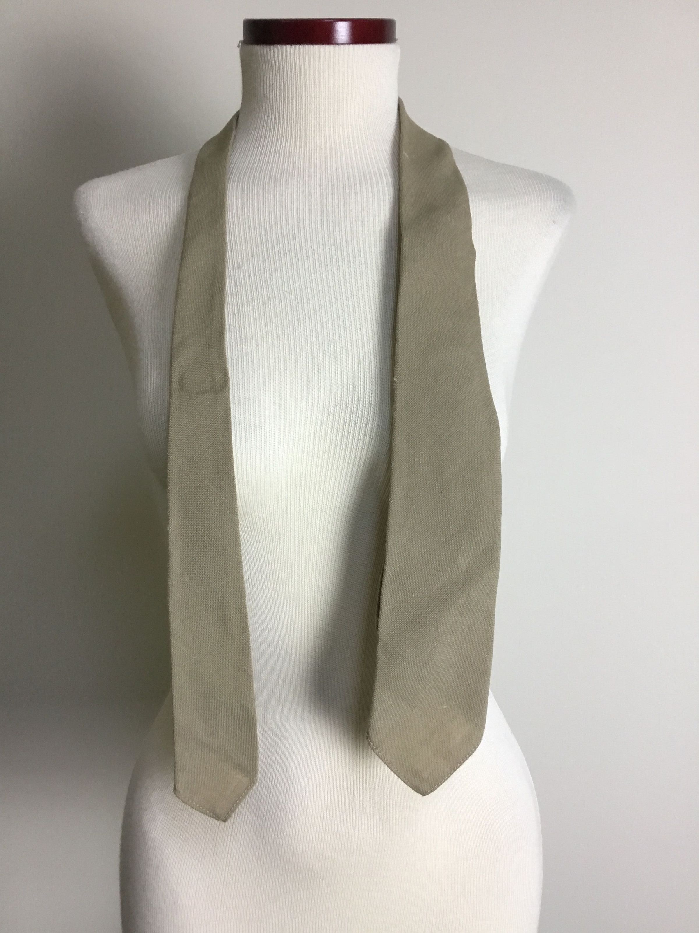 Women's army neckties. A: wool tie, tan. B: cotton tie, orange, 9517 on back. C: cotton tie, tan, 9517 on back B&C: "Made by Wembley, A new wartime fabric" on label.Collection