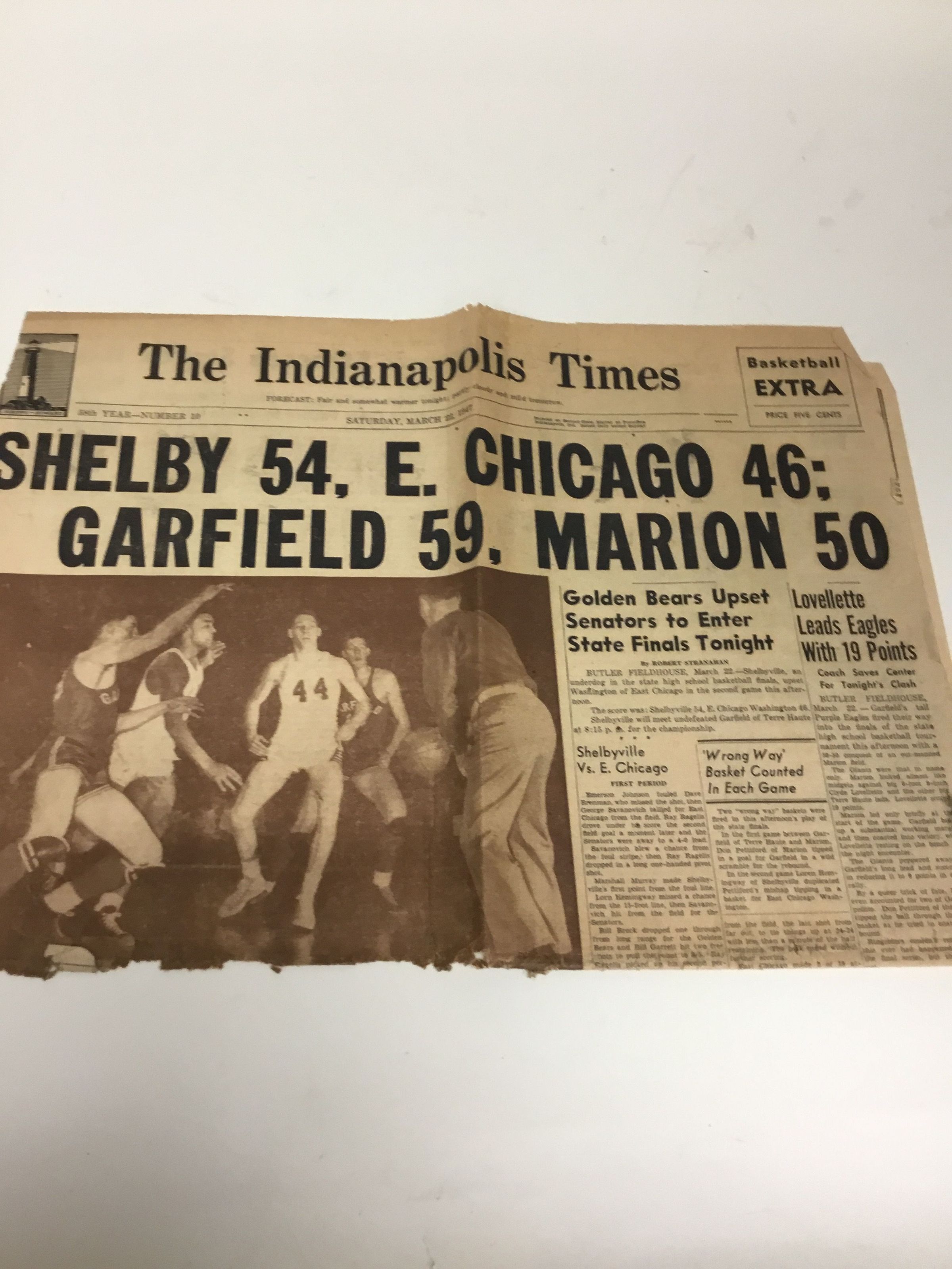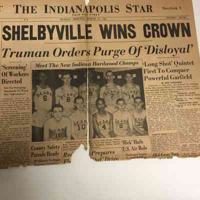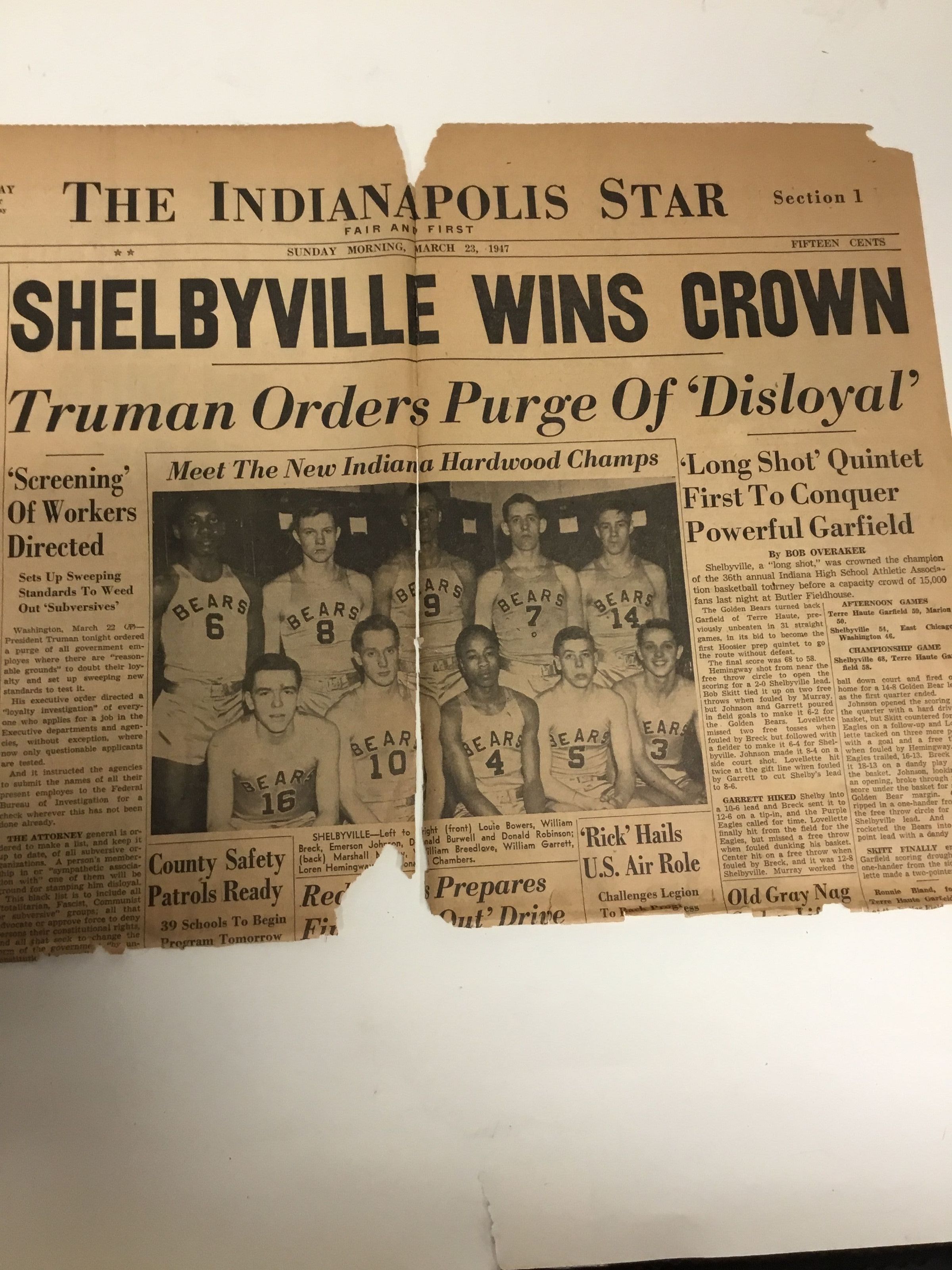 This was the only time Shelbyville High school won the state championship. One of the star players went to IU and became the 1st African American player in the Big 10, played for the Harlem Globetrotters and later coached Crispus Attucks to state championship.Collection