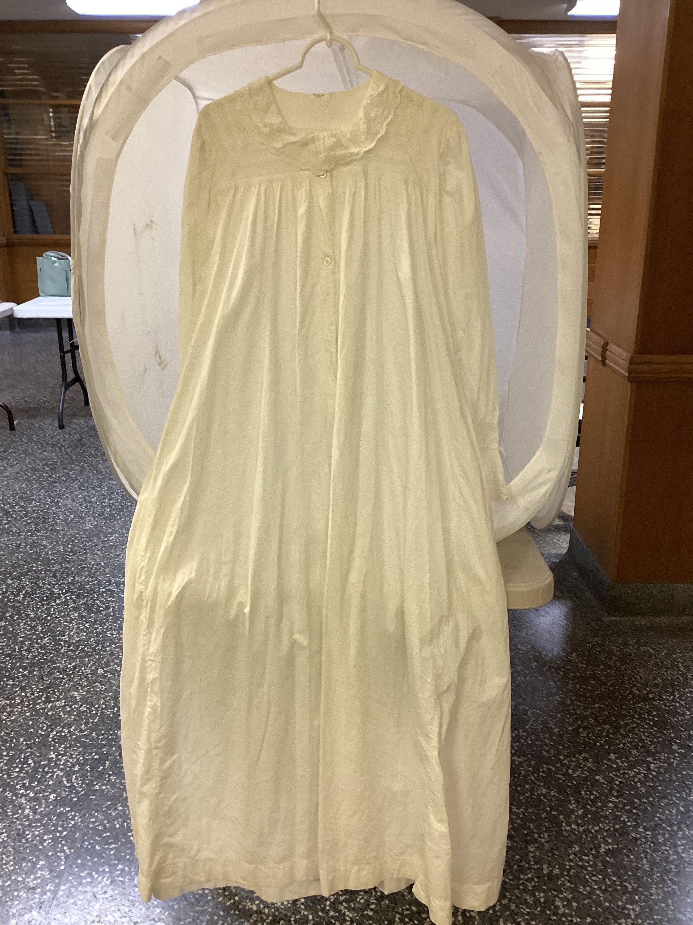 White cotton nightgown; square yoke of eyelet embroidery; eyelet ruffle around neck. Long sleeve edged with eyelet and ruffles.
