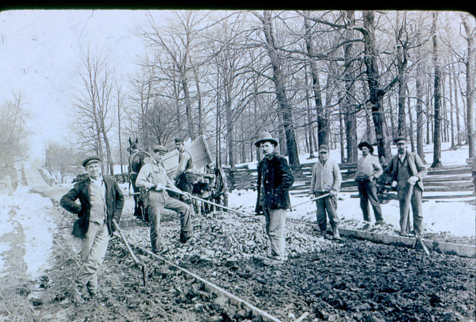 This is a slide made of an old photo. "Preparation form making a road/First stone road in Noble Twp"Collection