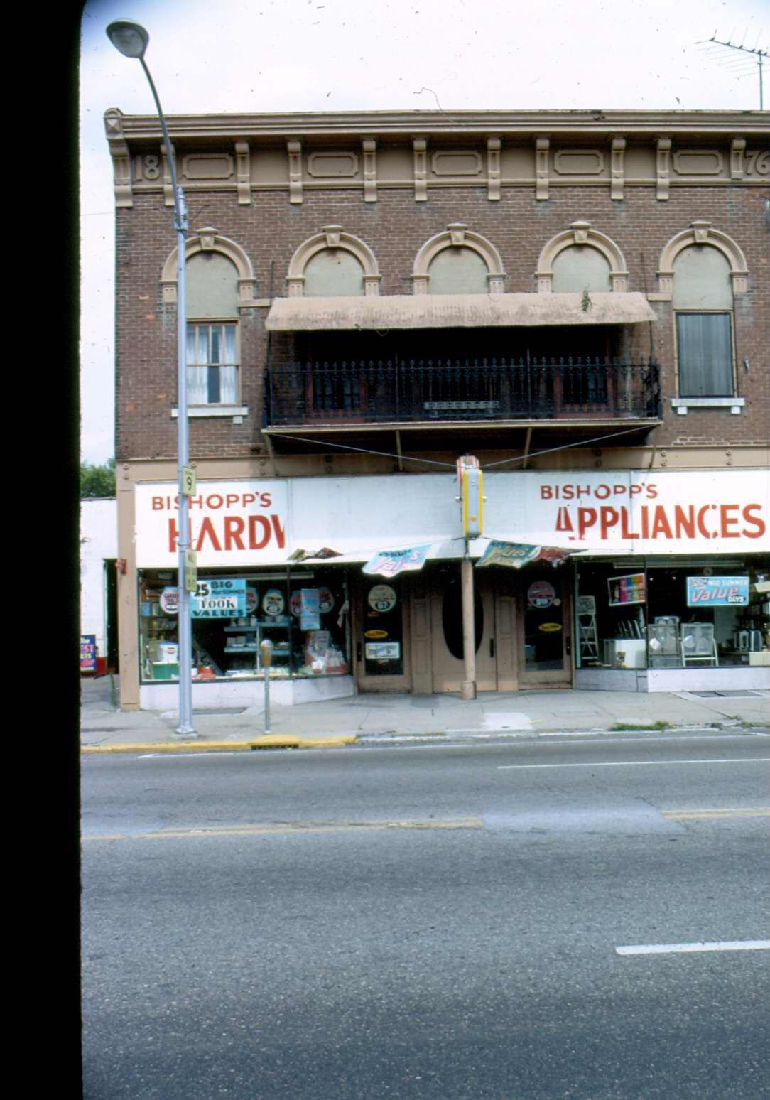 Image is a close-up of Bishop's Hardware and Appliances. Slide frame is marked: "YMCA"Collection