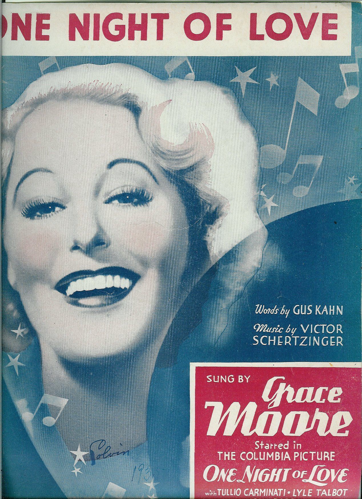 Physical Description: Face of Grace Moore with Blue Background and Blue Writing