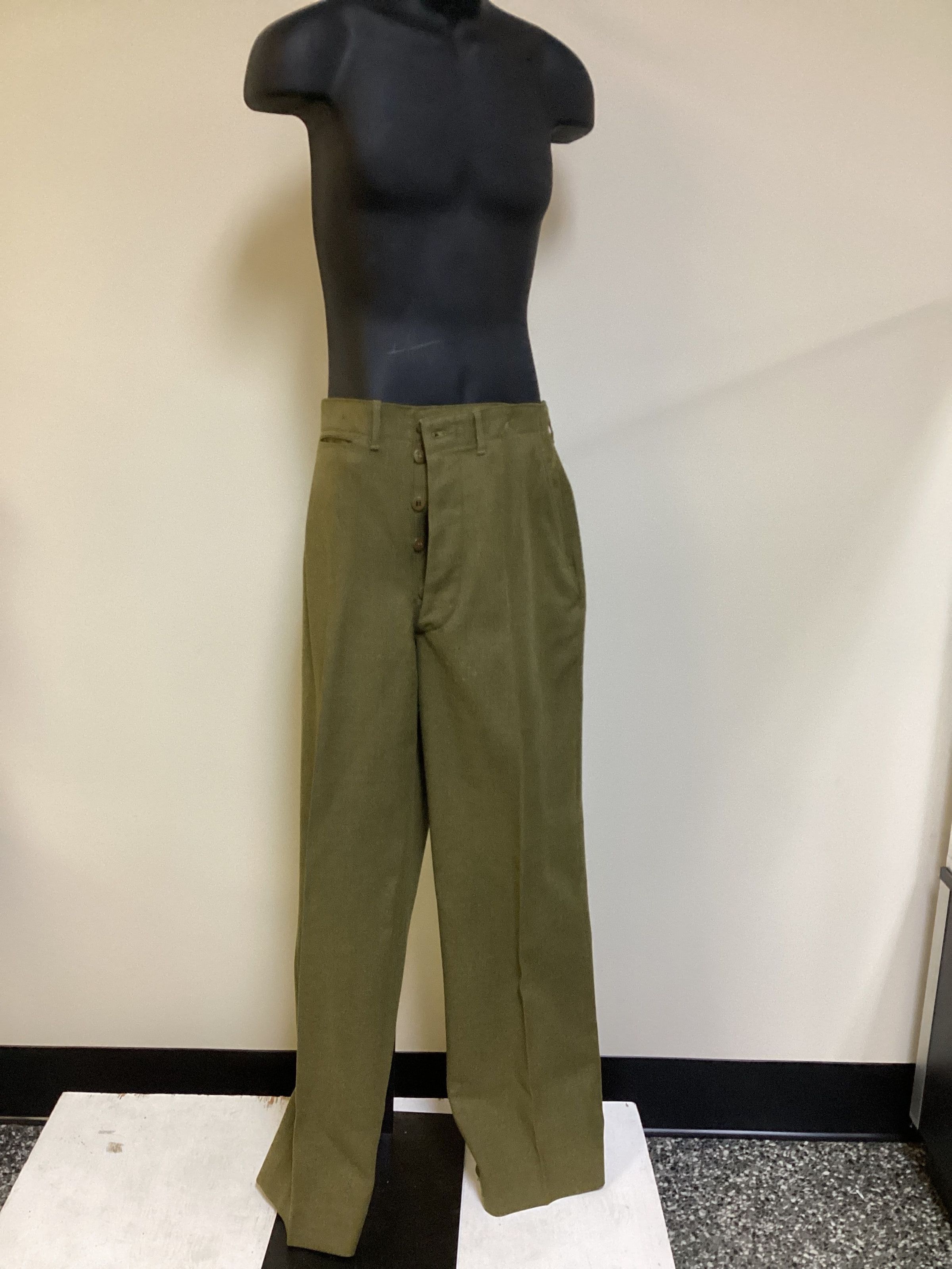 A: Olive drab pants with a five-button fly and one back pocket has a button flap. *****See Shelbyville Republican 12/15/1945, page 1, for data about Loren Miller.Use