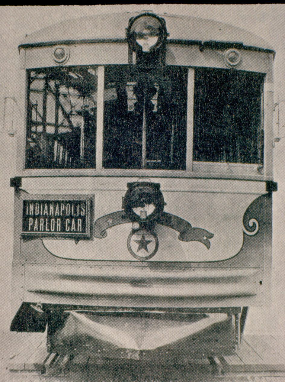Black & white; vertical format; copystand of dot printed image; head on view of interurban car; sign under motorman's window reads "Indianapolis Parlor Car"; has 2 round headlights located above & below motorman's center window; wedge shape solid cow catcher w/bumper above it; car all same shade except for area under motorman's window which is lighter shade & within this area is a darker banner shape that has a star on left side & below head lamp is dark circle on light field w/dark star inside circle.
