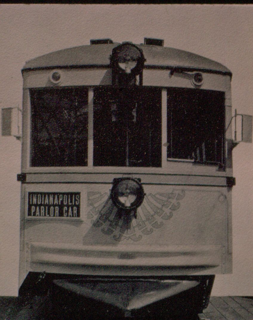 Black & white; vertical format; head-on view interurban car; streamlined; roof is darker than rest of body; there is a horizontal band below motorman's windows that is in-between shading of body & roof, some decorative work in vicinity of lower head light; round upper head light flanked by smaller, round dark lights; dark, wedge shaped solid cow catcher there is a bumper above cow catcher; sign reads "Indianapolis Parlor Car" ;has side mirrors.