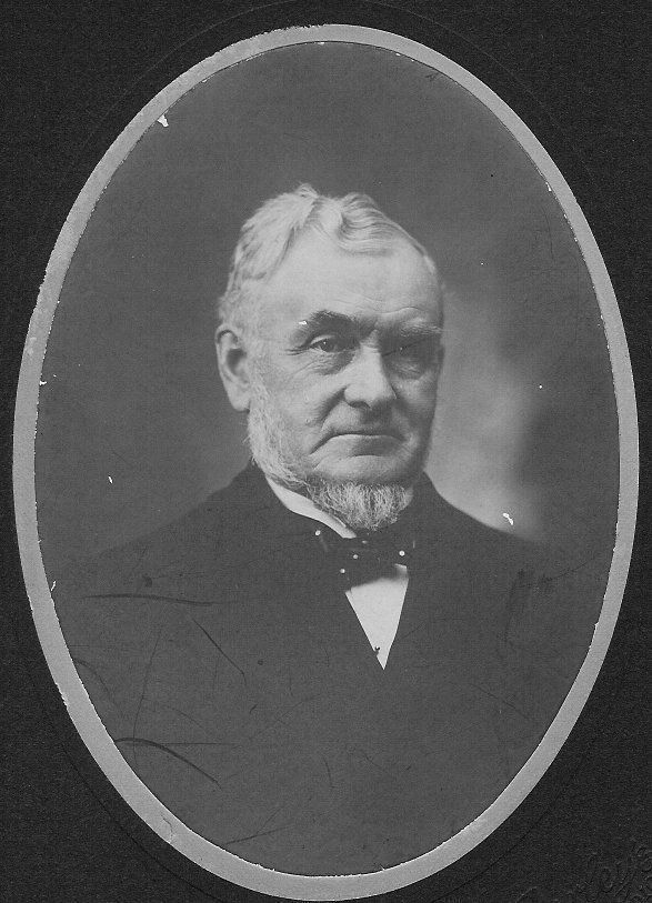 Cabinet size print, black and white oval. Elderly man under jaw and chin beard shows. Wearing white shirt and short dark tie wiich has polka dots; a stud button on shirt. Has gray hair parted on left side. May be Judge William Peasley.Collection