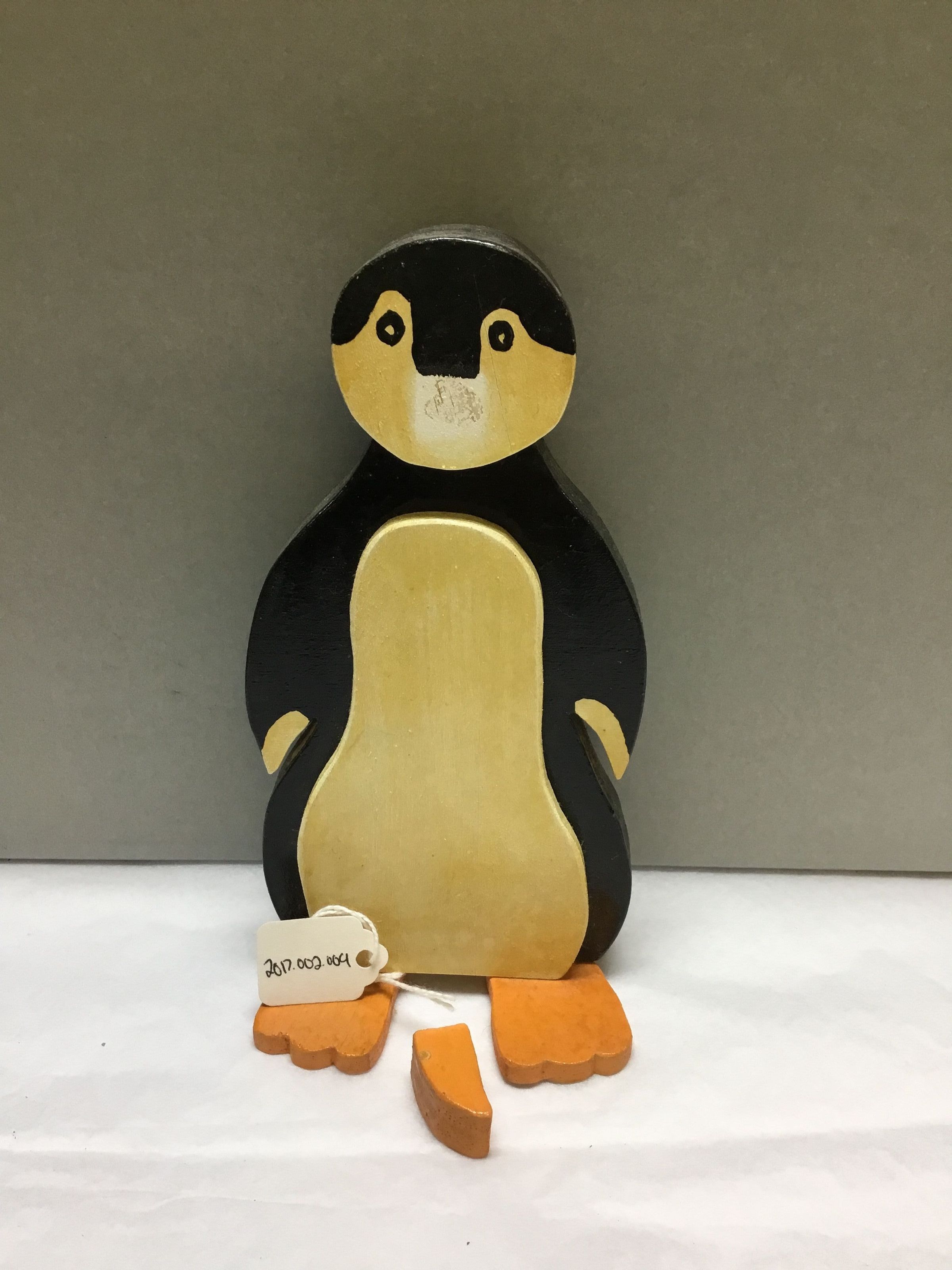 Penguin toy. Black and white (yellow due to discoloration) penguin with orange feet and beak. Bottom says "Steve Applegate 1993" Beak is detached at the time being 4/13/17