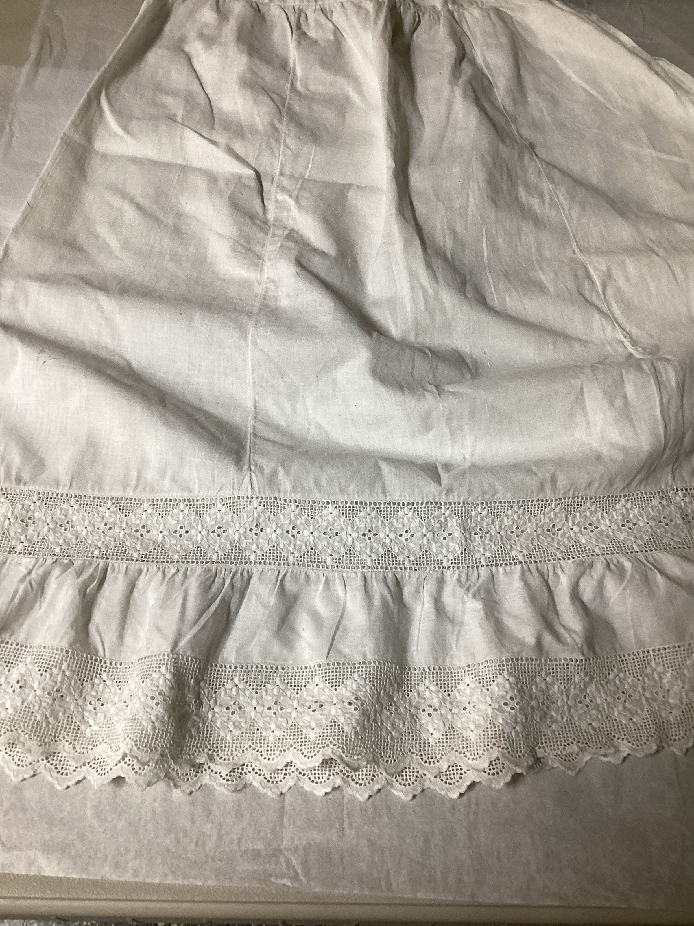 White cotton petticoat with Broderick anglaise and crocheted cut work at bottom, in 2 rows.