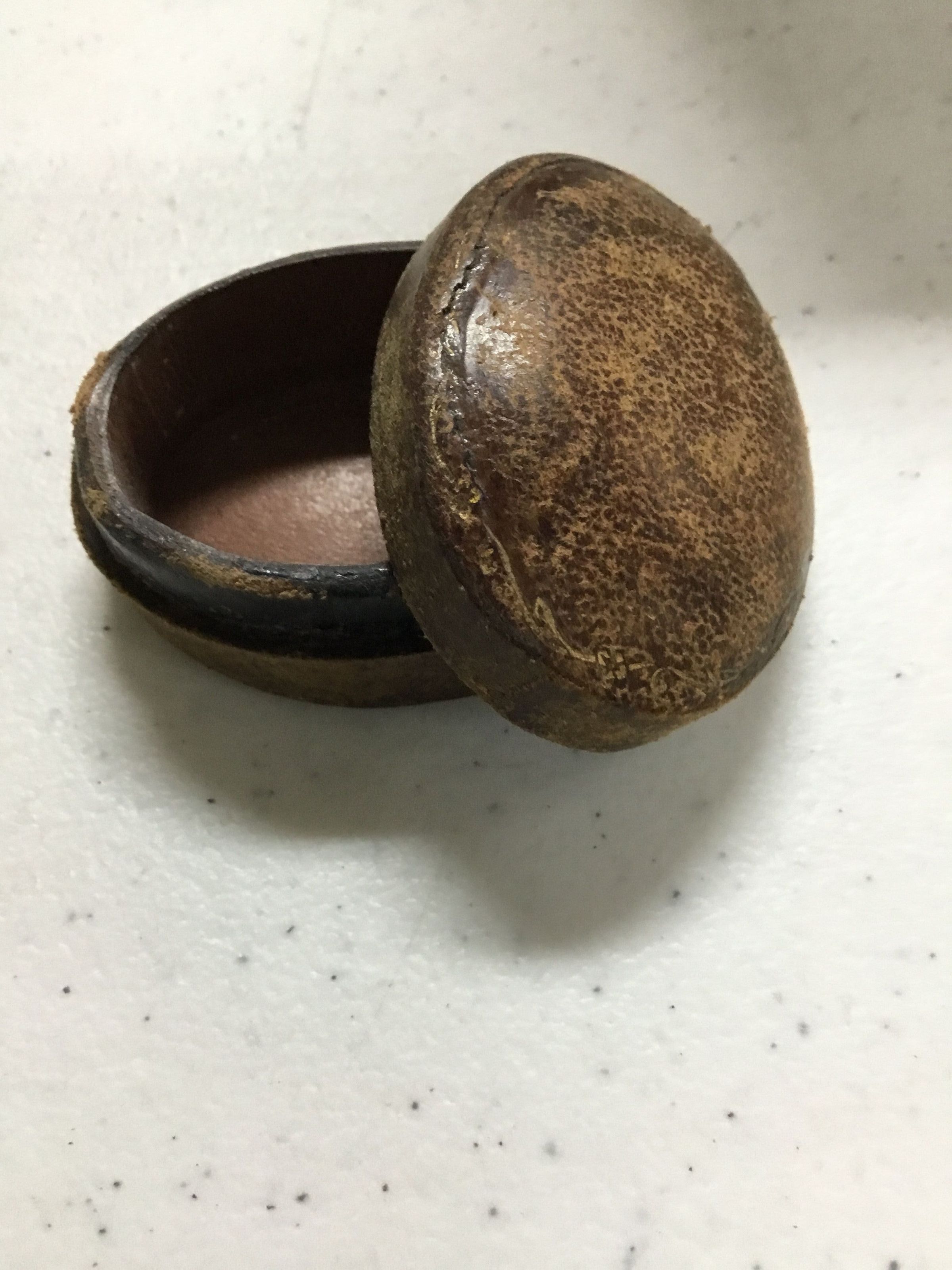 Brown leather look pillbox; oblong shaped with gold trim around lid; made in 2 pieces, top lifts off to reveal storage compartment for pills.Collection