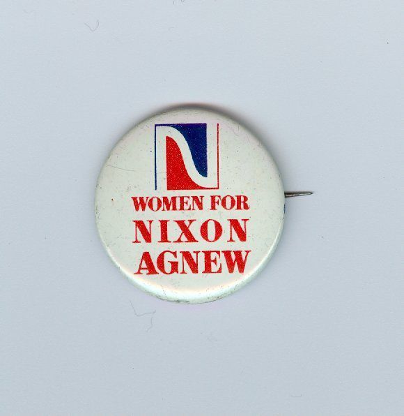 Political Pin: white background; red & blue ink; logo at the top with type underneath reads: WOMEN FOR/NIXON/AGNEWCollection