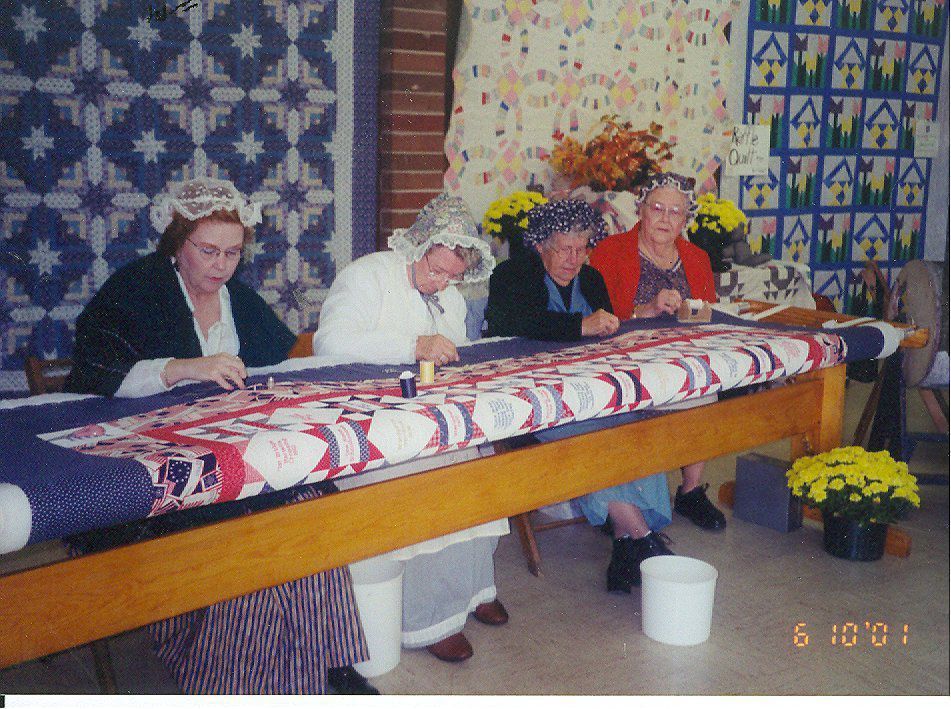 Quilters Guild exhibit at the Blue River Valley Pioneer Fair. Left to right: Loletta Hall, Mary Stafford, Marietta Shaw, Marian Hickman.Collection