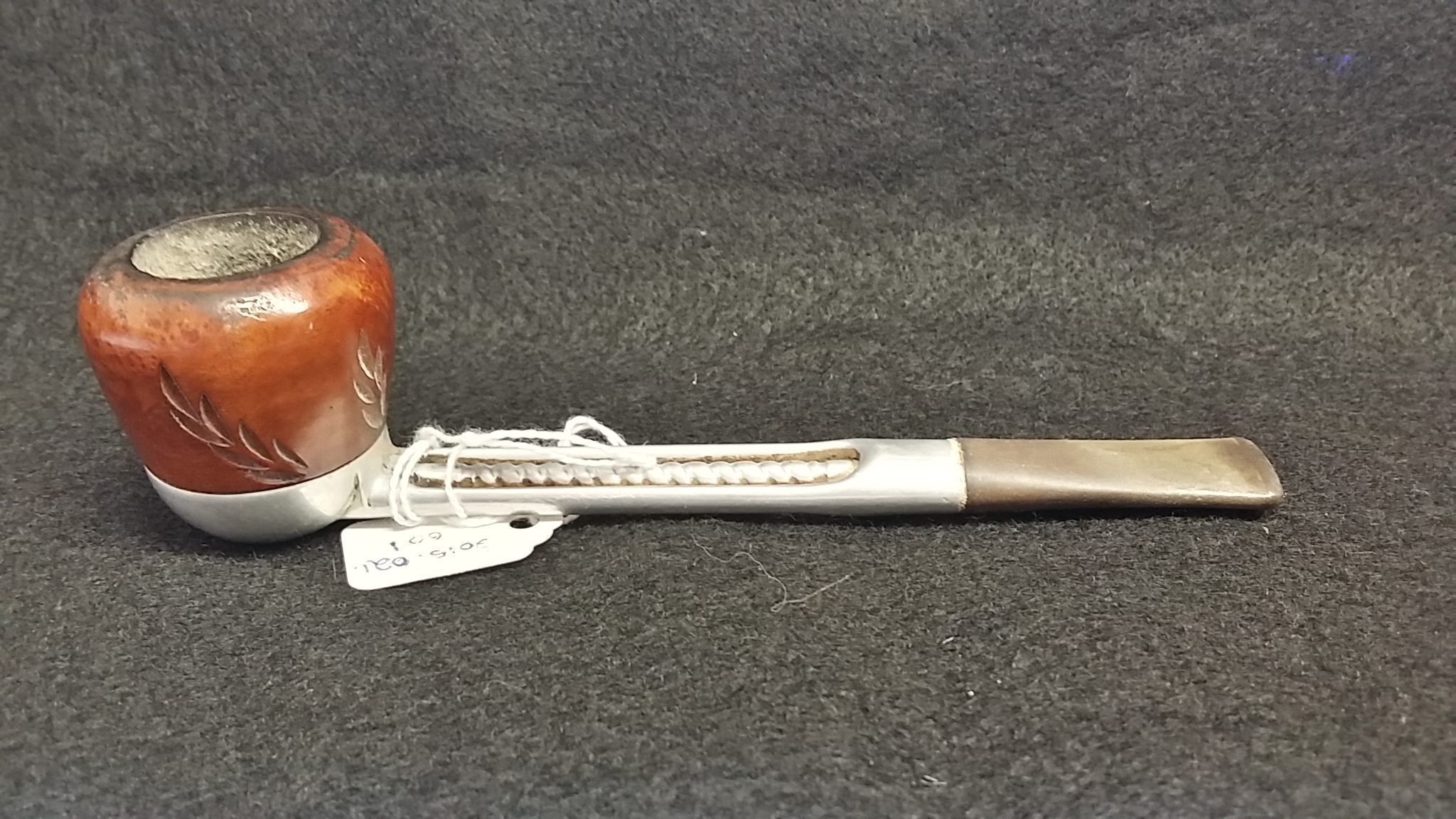 5 3/4 inch tobacco Falcon pipe; the wooden bowl is about an inch long and features a design similar to a wheat plant; the bowl is connected to a metal pipe, which features a filigree center; the mouthpiece is flat and is a worn brown colorCollection