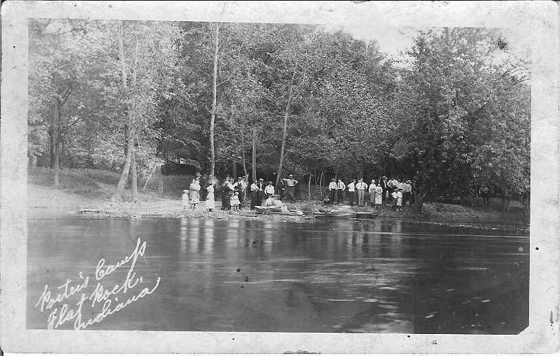 Donation, 07/26/2005. Black and white postcard in landscape format. On back in pencil: "Porter's Camp/1910" On front, in lower left corner: "Porter's Camp/Flat Rock,/ Indiana." Image is of a group of people at the water's edge, water in foreground, trees in background.Collection