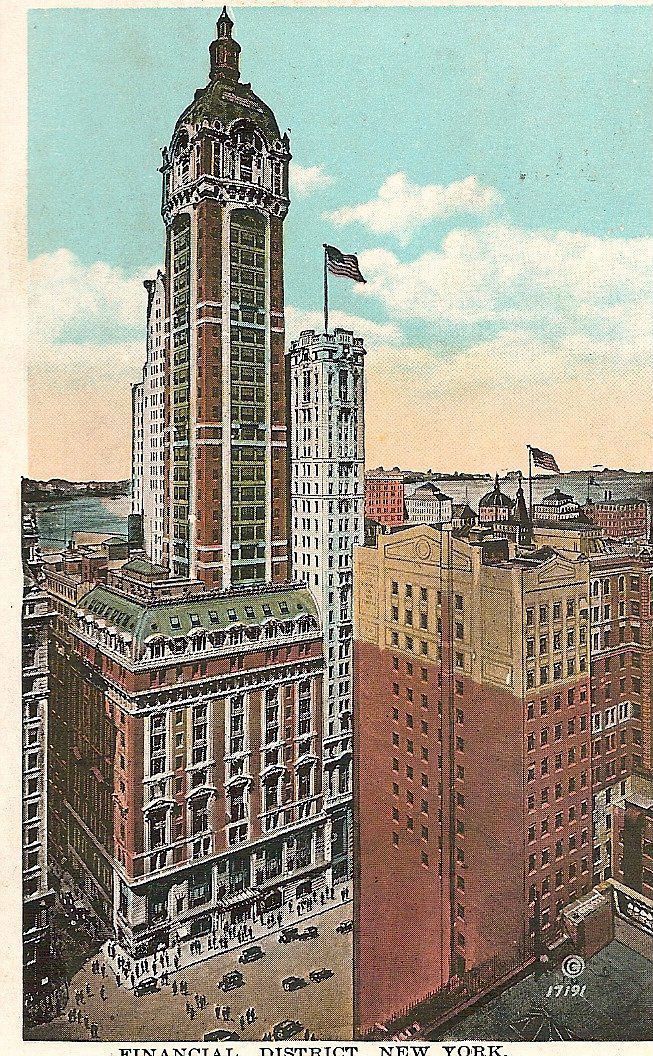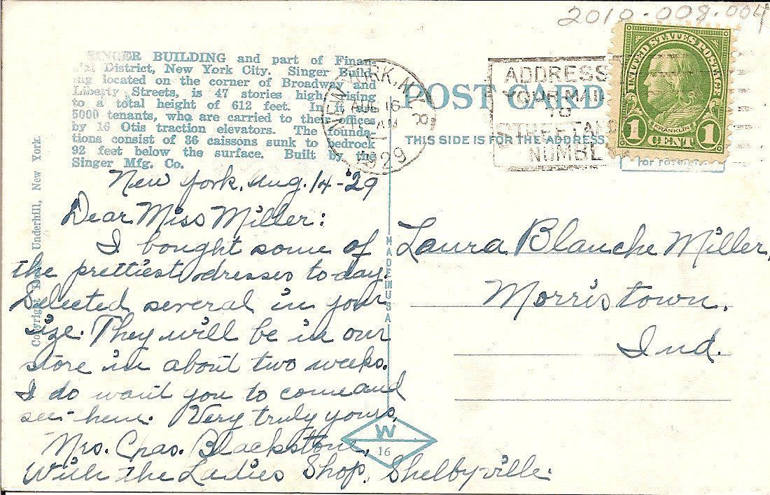 Personal postcard correspondence from Mrs. Charles Blackstone to Laura Blanche Miller of Morristown, Indiana. Front of postcard (vertical format) shows an artist's rendition of skyscrapers. Top border of card reads: SINGER BUILDING AND PART OF; bottom border of card reads: FINANCIAL DISTRICT, NEW YORK. In her narrative to Ms. Miller, Mrs. Charles Blackstone writes: "I bought some of the pretiest dresses today. Selected several in your size. They will be in our store in about two weeks." (More writing on the card)