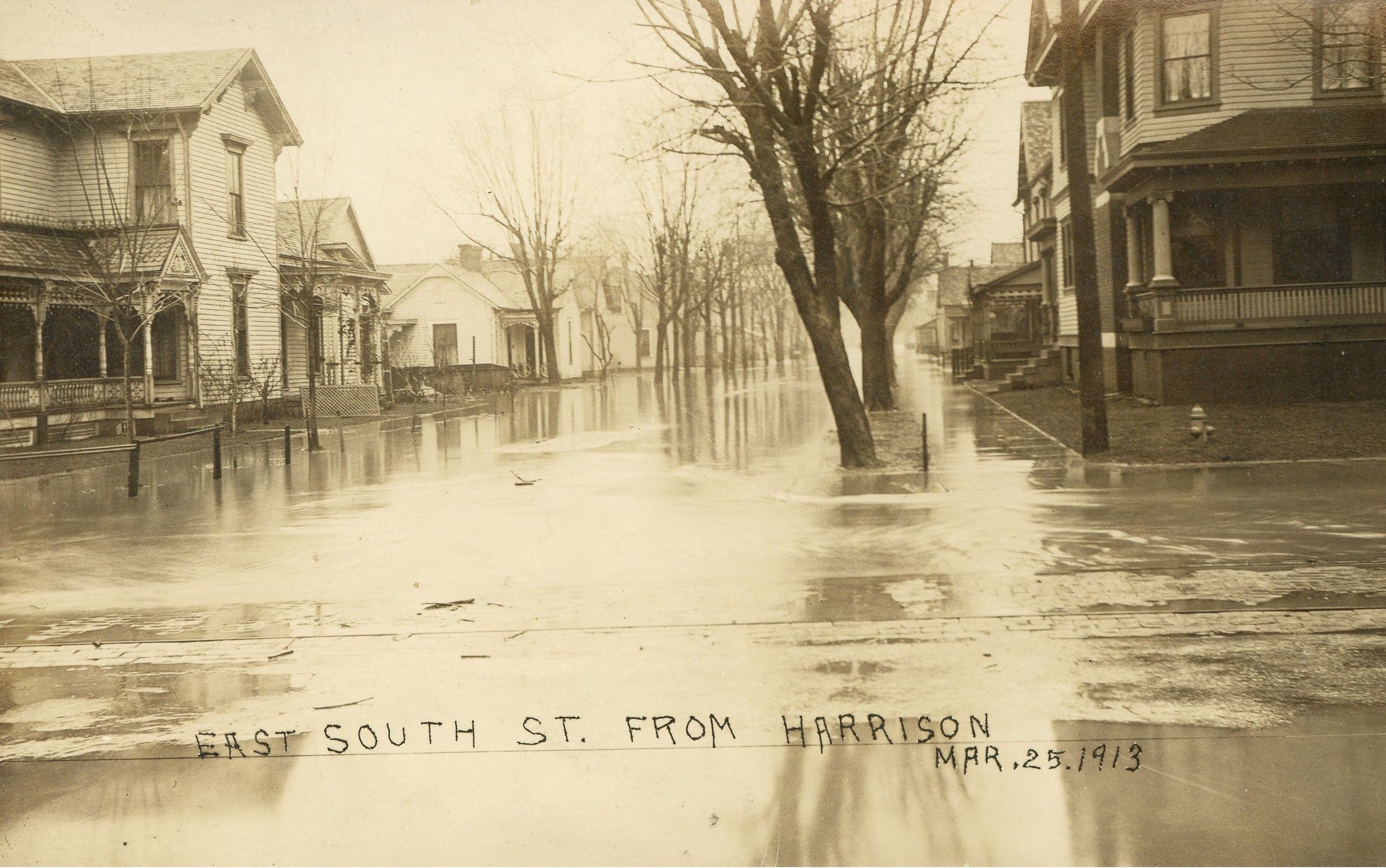 Black and white post card; flooded street scene of where 2 streets intersect; from right to left is a row of houses,row of trees, the street, row of trees,aand row of houses; negative acratekdt top print "East South St. from Harrison/ Mar 23, 1913.