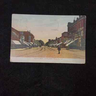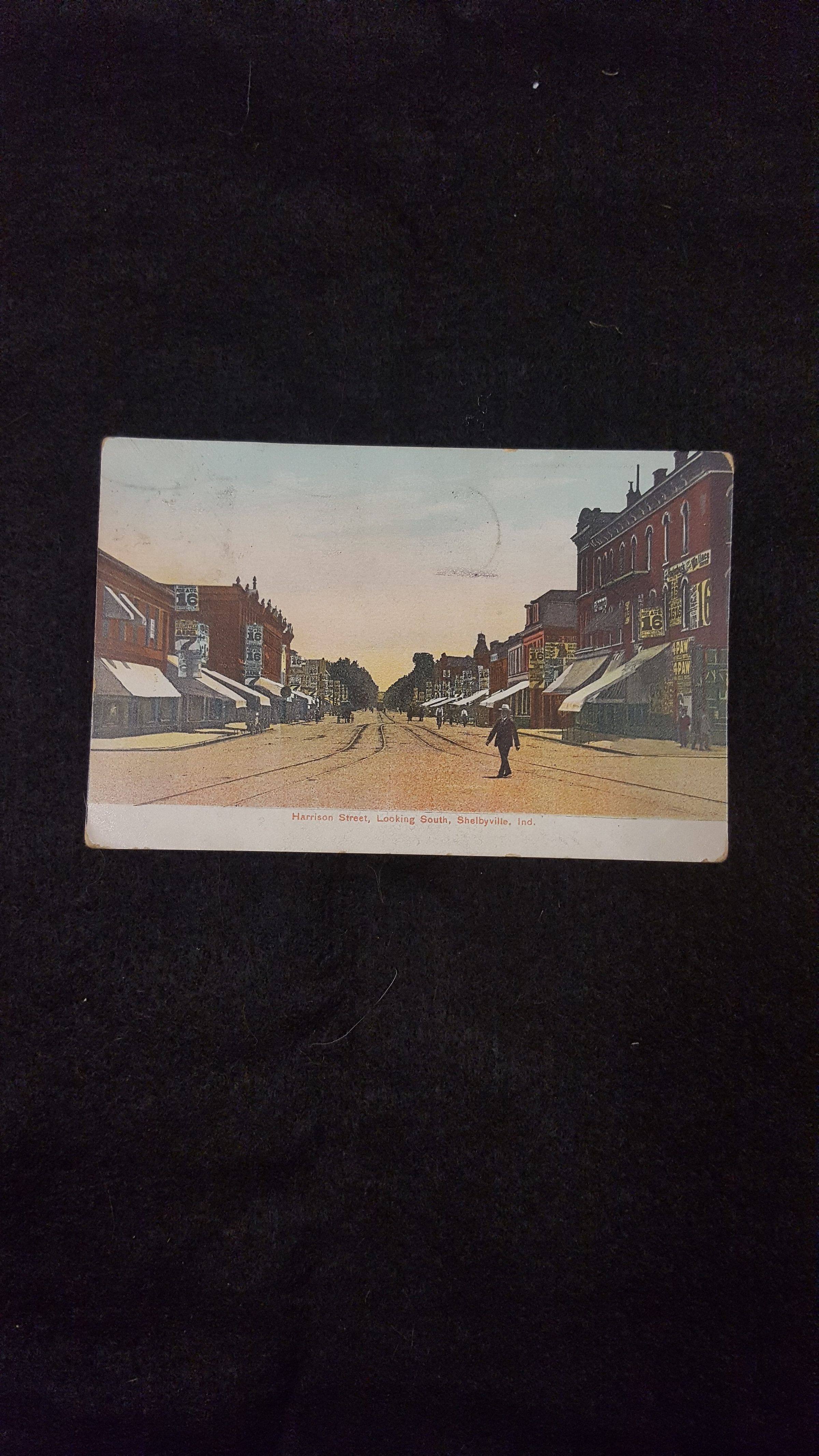 Postcard dating back to October, 6, 1909. Written by a local man named Harry Vaught to a lady he refered to as Miss Edna Sparks of Ohio. It is a friendly note with no specific detail of important world or local events. On the back side there is an illustrated photo of Harrison St. in Shelbyville, IN. Across the bottom in red ink it says, "Harrison Street, Looking South, Shelbyville, Ind."