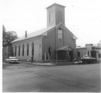 Black and white snapshot; image is church building; angle shows the front and one side; roof line is akin to Greek Revival but does have gothi windows, 5 on the side and at least one on the front; roofed section of doorway in front; square bell tower raising from peak of roof; looks as if there is a lean to additon on back; car parked at eh curb on the side and a pick up truck parked in front.