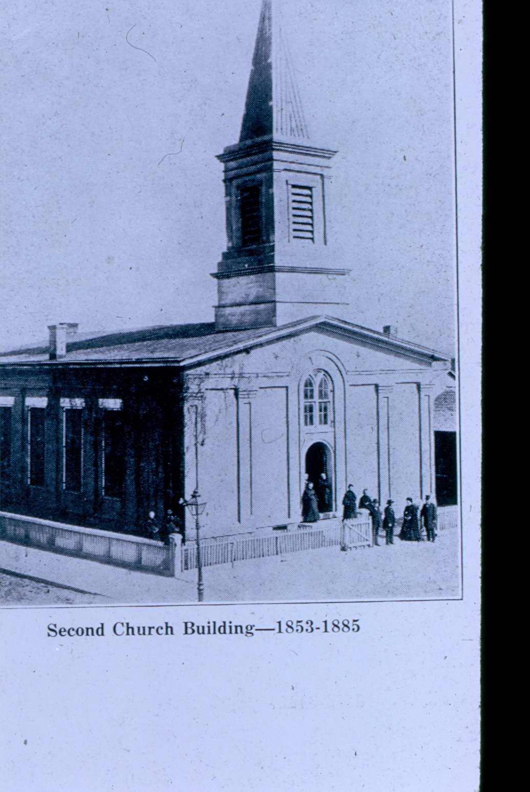 Black and white photographic slide in portrait format. Slide frame is marked: "Presbyterian Ch. Jackson & S. Har." This is a slide of a picture in a book. Caption under picture reads: "Second