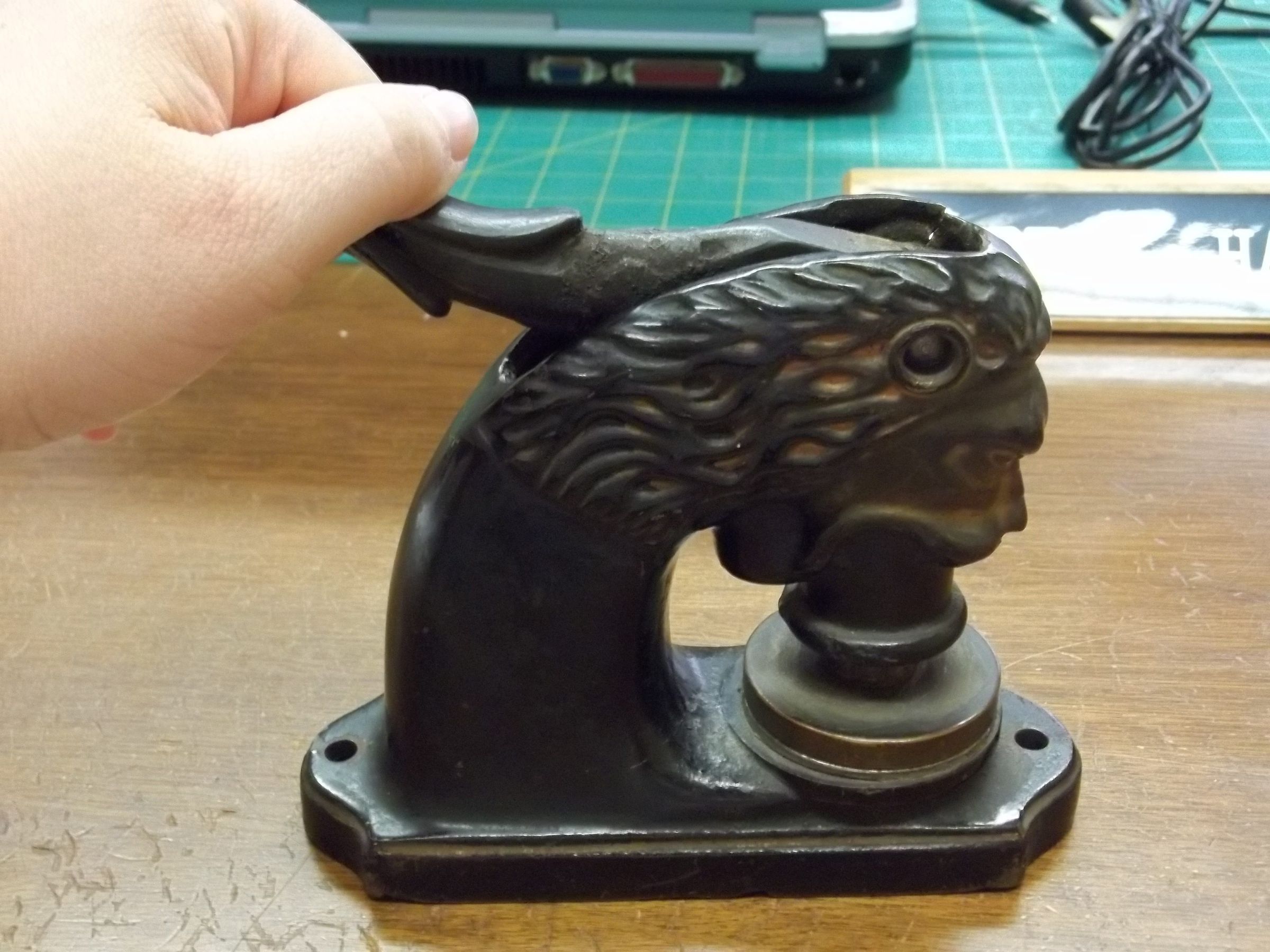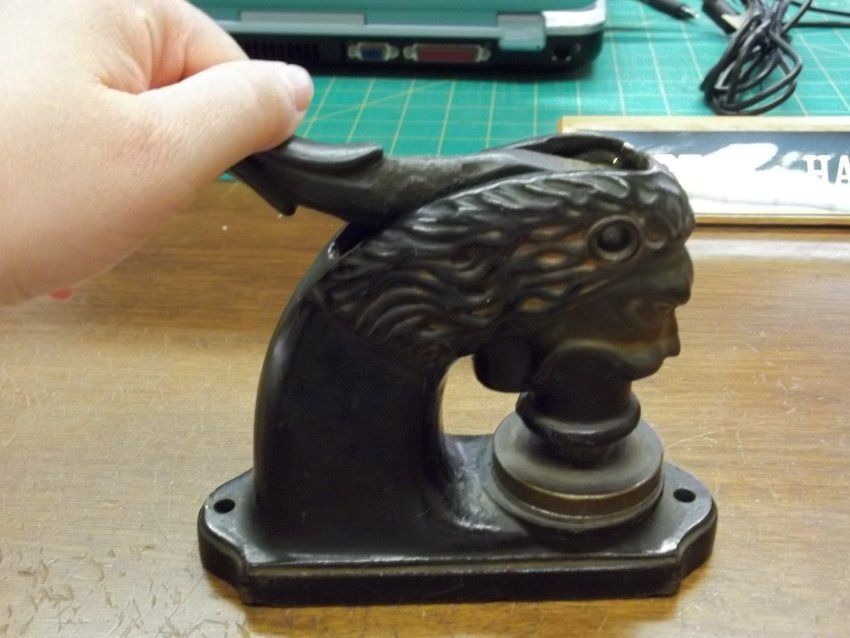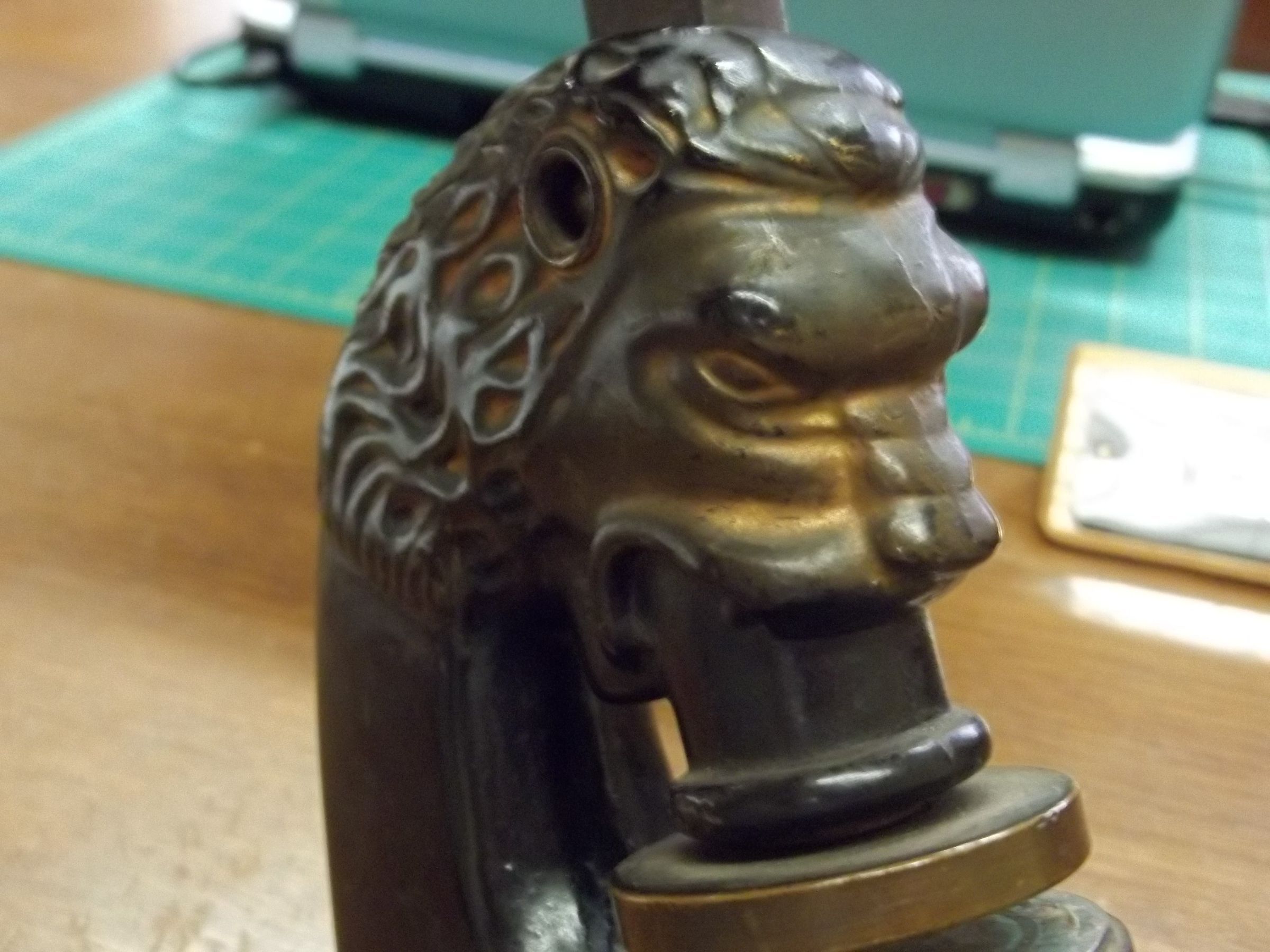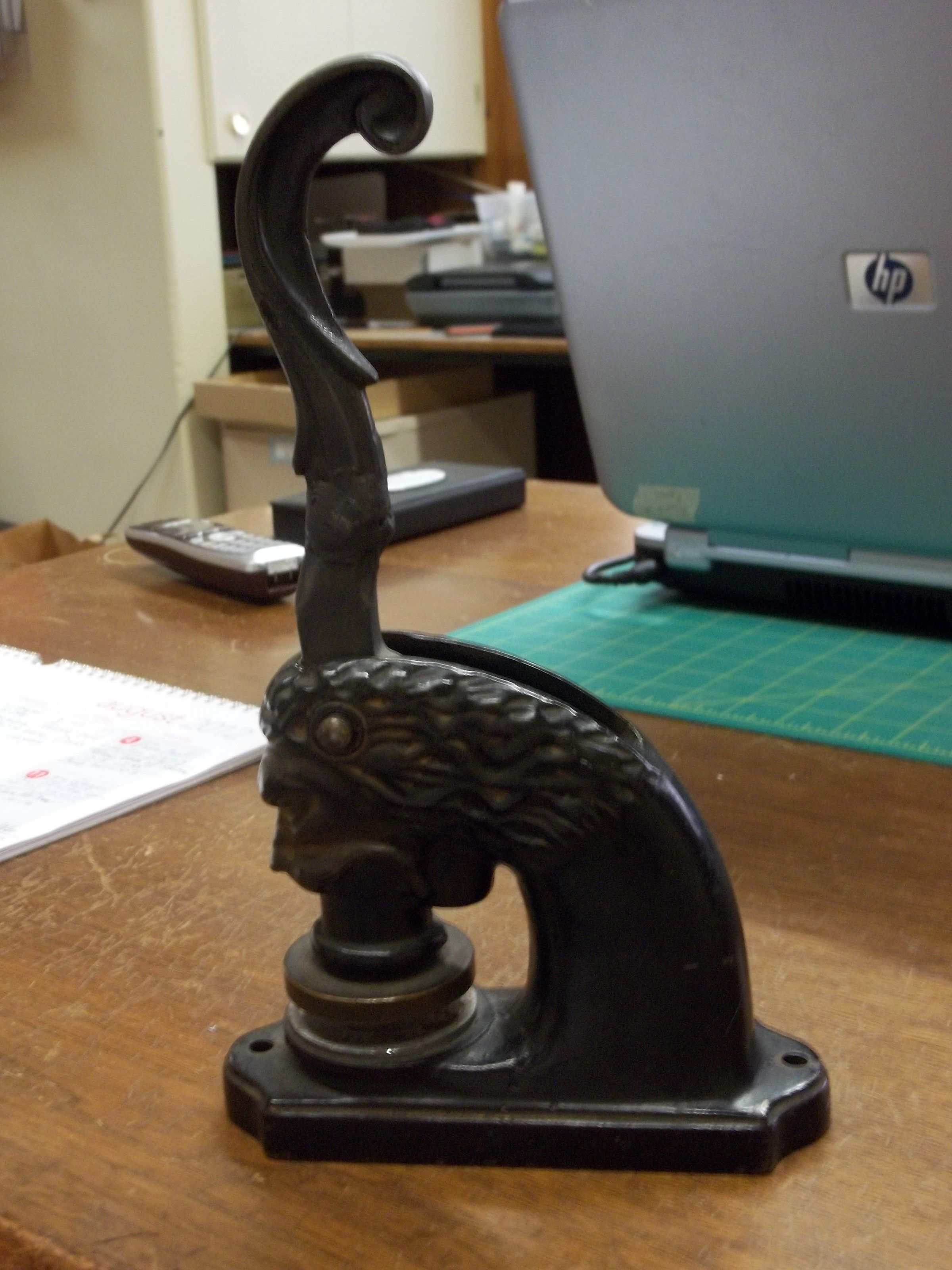 Among the clerical objects from the Fountaintown Tuesday Club. A press used for embossing a seal on local documents. The seal is comprised of two circles. The outer circle has "Indiana" across the top along with six stars, three on each side of the word. At the bottom is "Shelby County Seal." The inner circle has the words "Commissioner's Board" and a decorative emblem. The object is made of heavy iron with a lever that when pushed down presses two circular seals together. The body of the press is fashioned in the form of a lion head. The top seal appears to come out of the lion's open mouth when the lever is pushed down.Collection