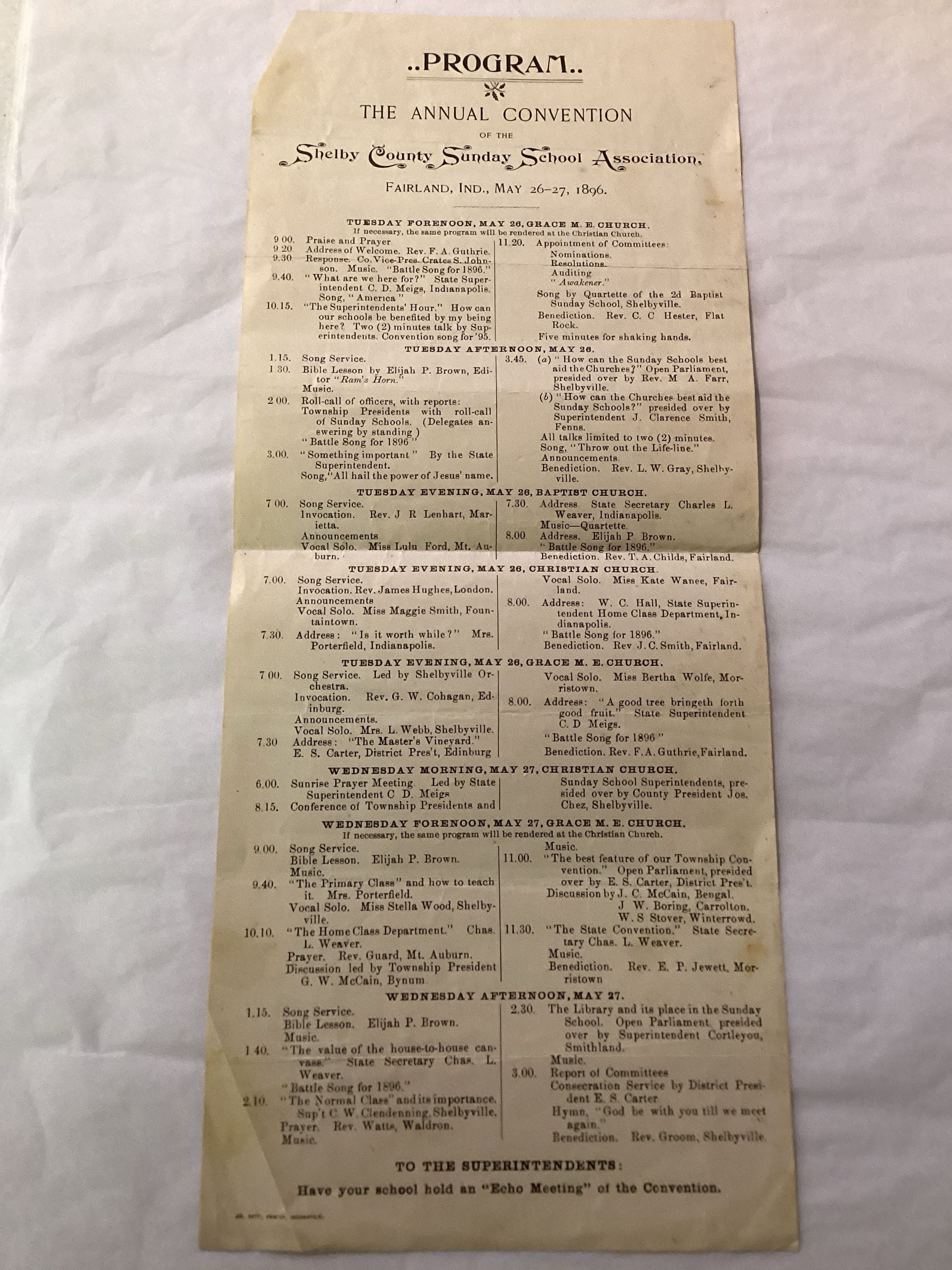 Program. The annual convention of the Shelby County Sunday School Association, Fairland, Ind, May 26-27, 1896.Collection