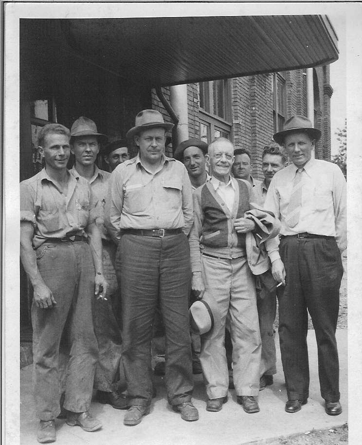 Donation, 07/26/2005. Black and white matte photographic print in landscape format. Image is of nine men posed for the camera. None have been identified. On back: "June 1946/Snapshot by C. G. Linville/Public Service/ employees."Collection