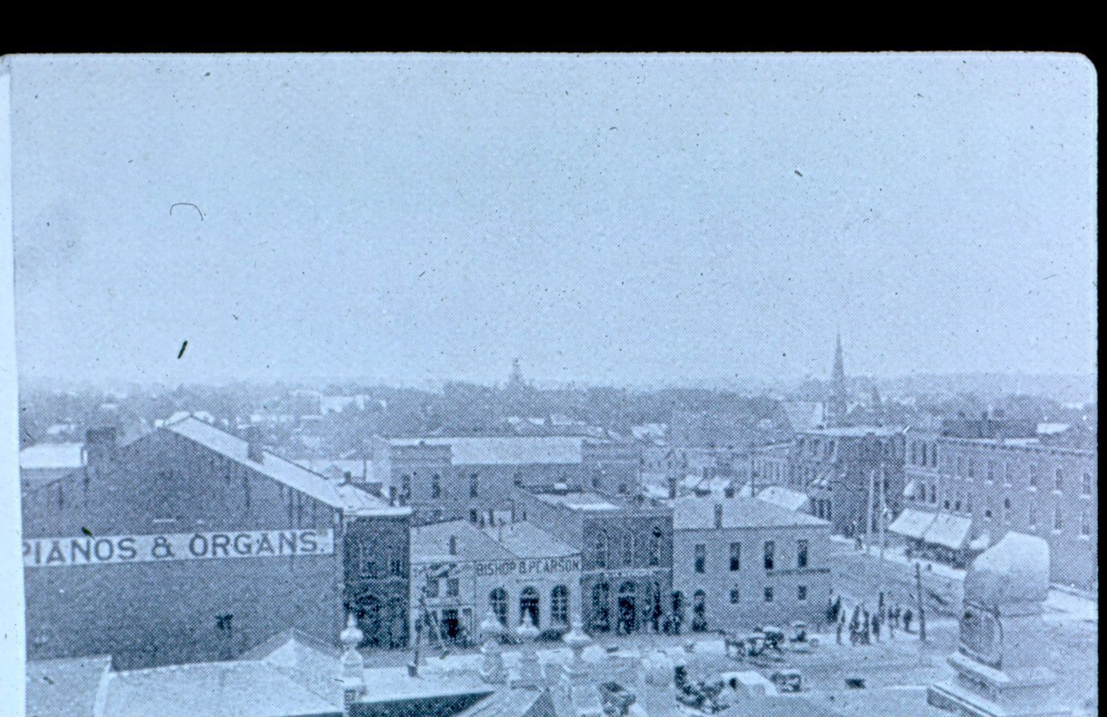 Donation, 07/26/2005. Black and white photographic slide in landscape format. Slide frame is marked: Public Square South East. Corner 1895." Caption reads: "Looking south west from Opera House."Collection