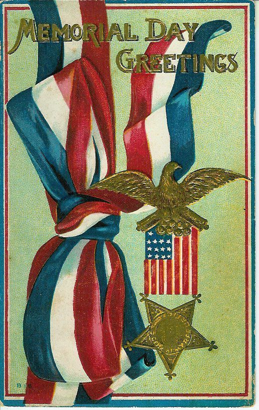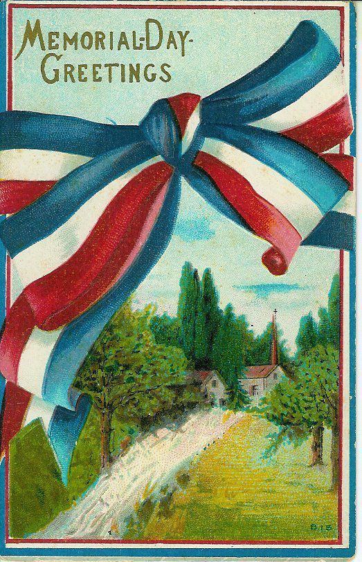 B: Memorial Day Greeting with red/wh/blue ribbon, at bottom right-hand corner is a country church scene