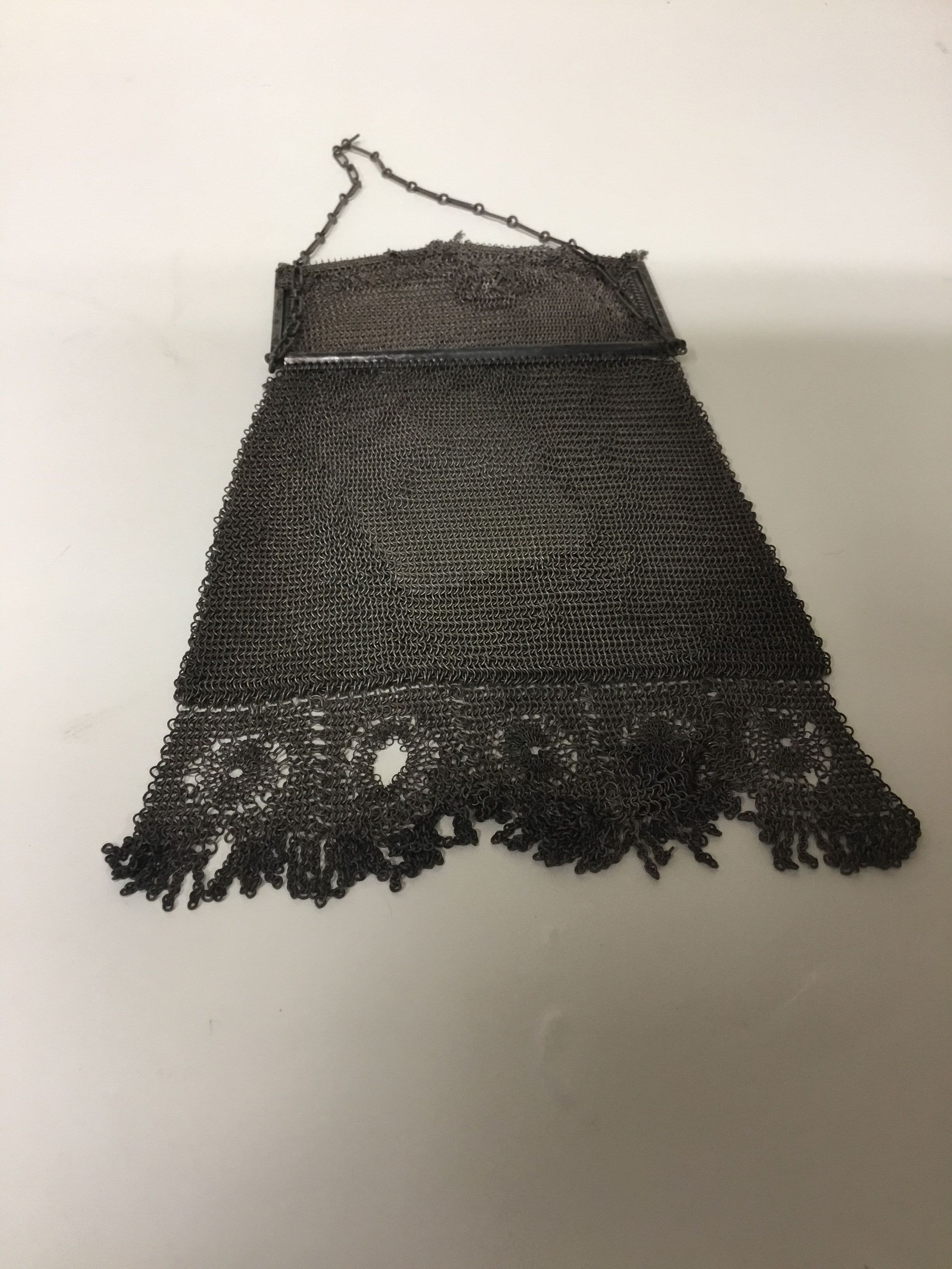 Purse, dark silver, chain handle. Initials "V.L.W." on a button on the flap. Used by Velva (Warble) Duffy of Shelbyville, Indiana.Collection