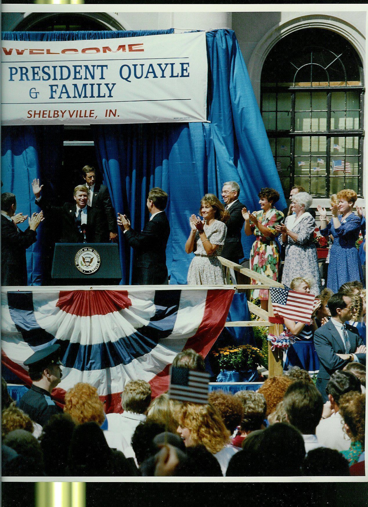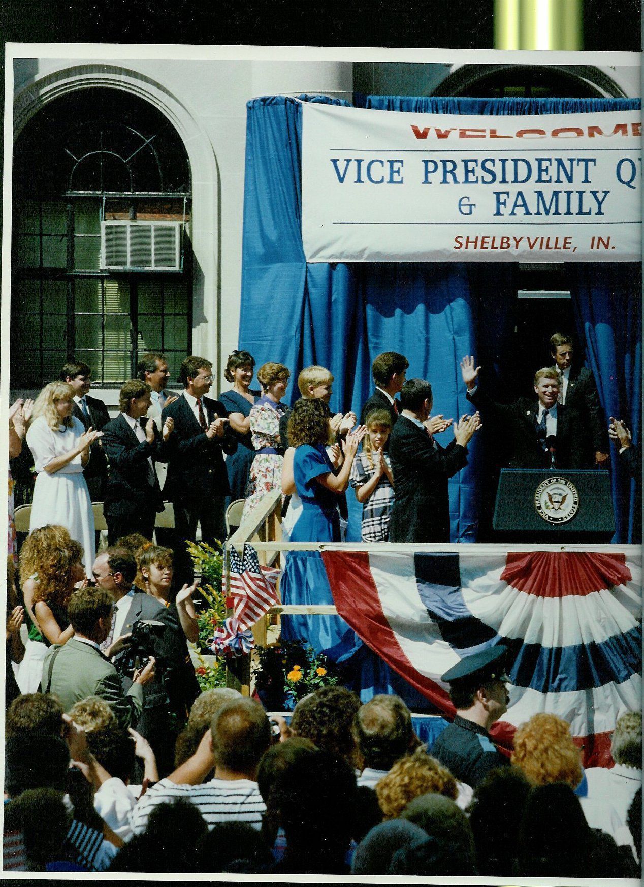 Picture taken for Shelbyville Newpaper Aug., 1990 of Vice President Dan Quayle in front of Shelbyville City Hall.