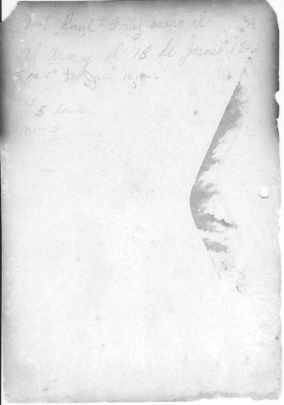 5" x 7" Black and white matte photo in portrait format. Image is a military portrait of Roy Oriz during WW II in his dress military uniform. Inscription on back is in Spanish.