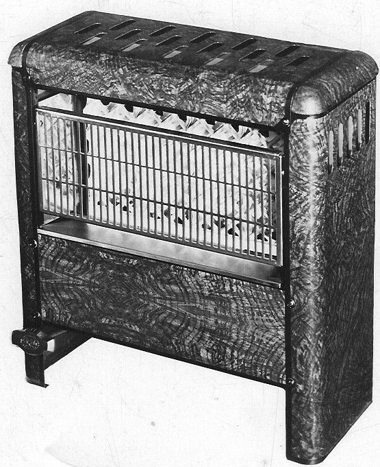 Black and white glossy photographic print that appears to be advertising photo for catalog use; subject is a space heater; top & 1 side panel visible, have vent; has protective grill across the front; metal surface is varied shade arrangement with bottom front panel appearing to be wood grain pattern; at bottom left of heater is a handle with embossed lettering reading "Ray-Glo"