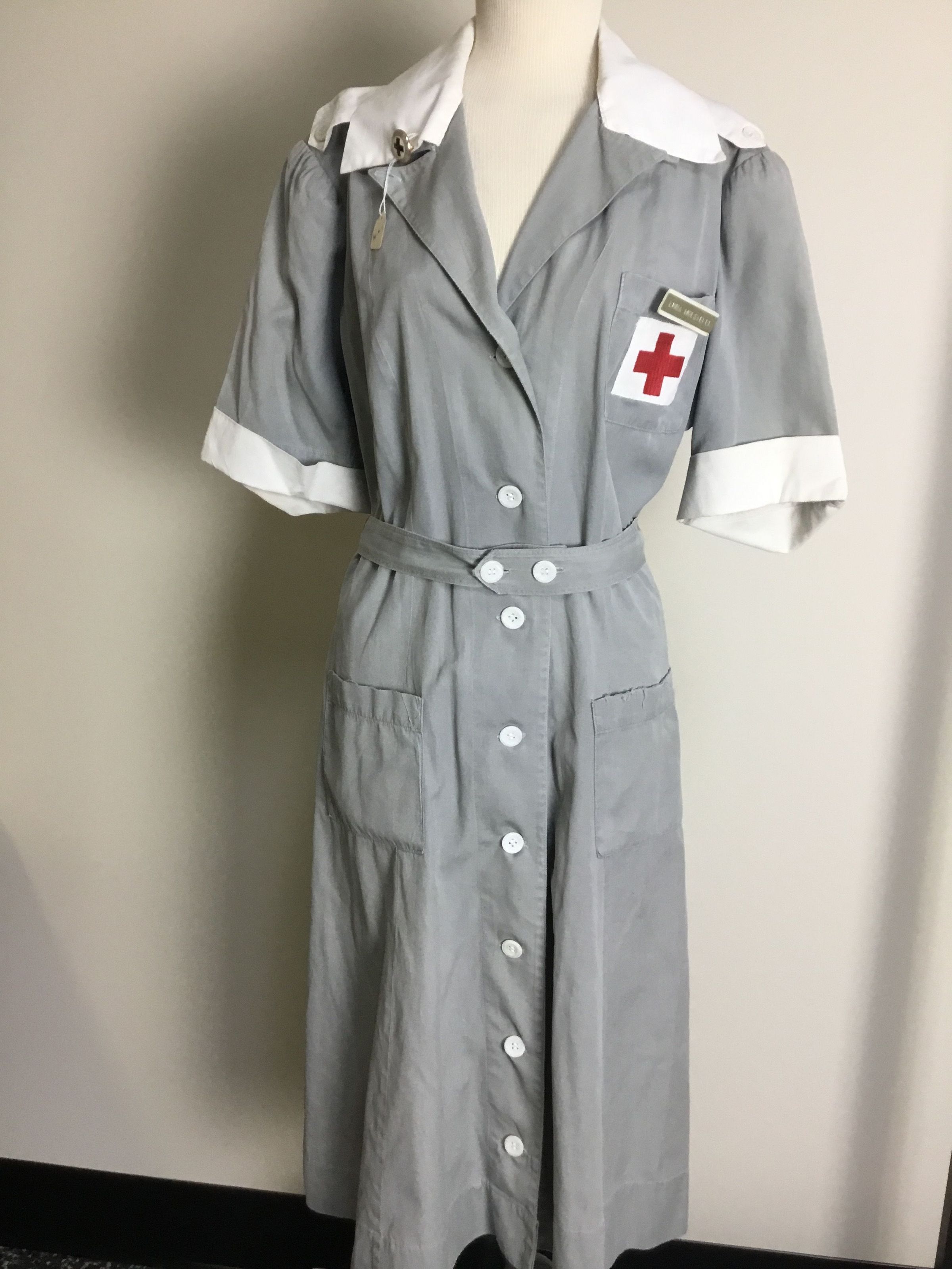 Grey Red Cross volunteer uniform, white collar, white sleeve cuffs, 8 white buttons down center, Red Cross patch on breast pocket. 2 patch pockets below waist. Sewn in tag at inner neckline “Shane DeLuxe Uniforms, Evansville, Indiana 18.
