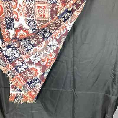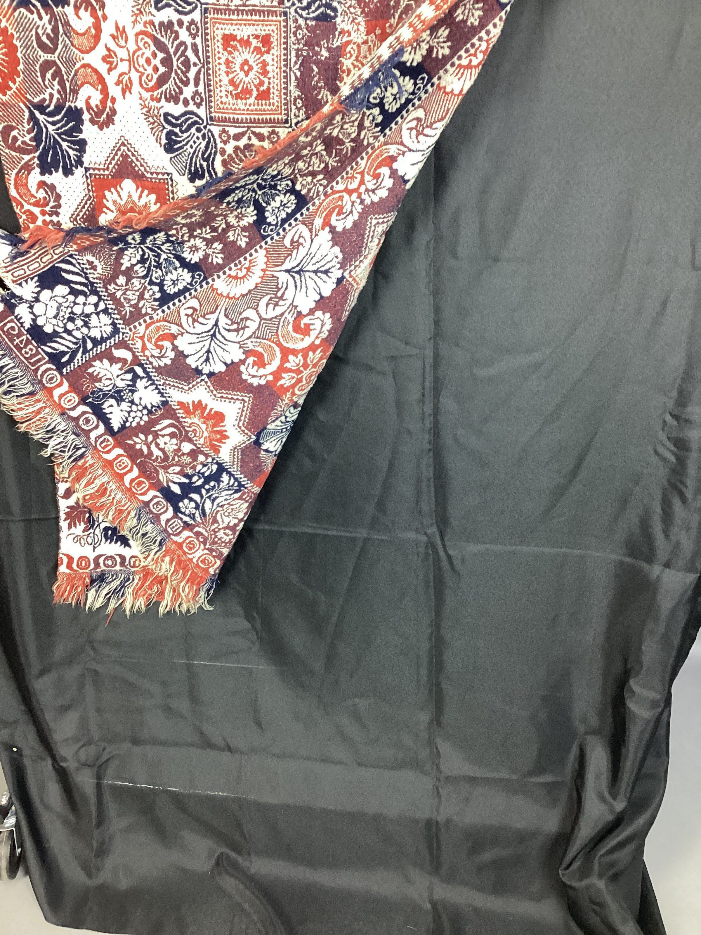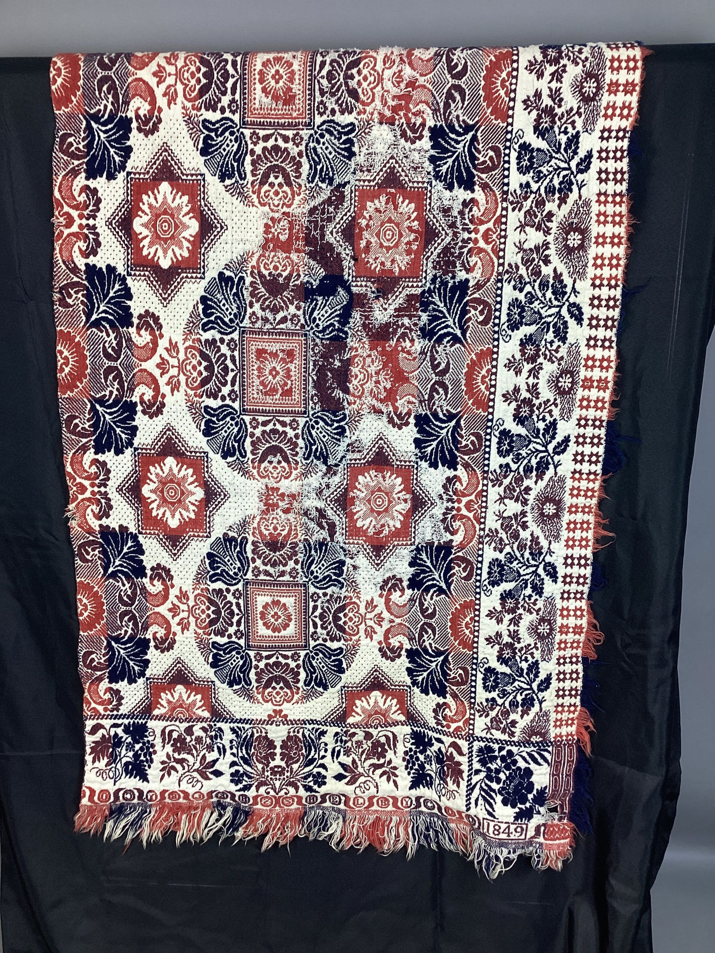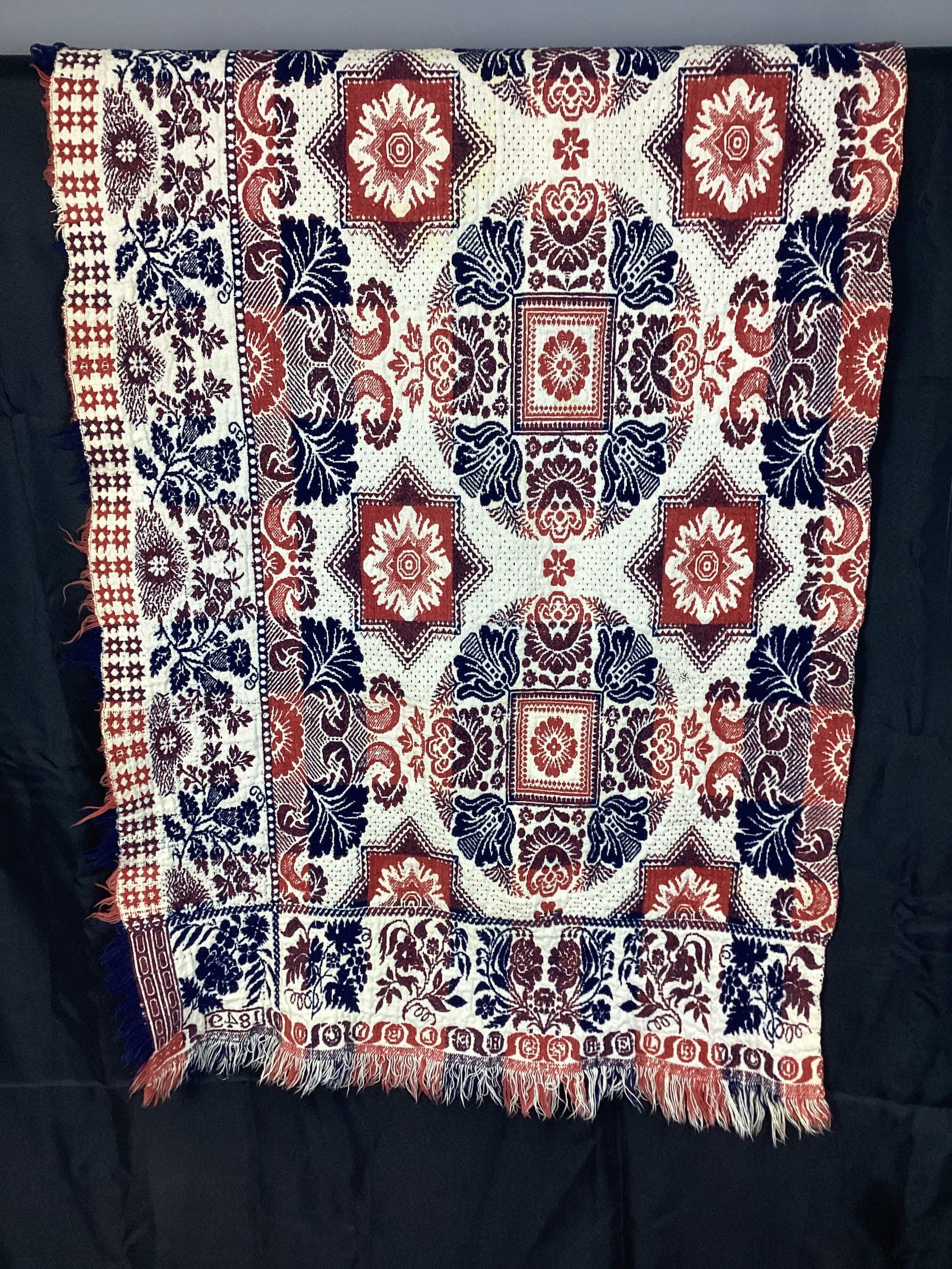 A Jacquard coverlet woven in red, blue and white; it is in 2 pieces with each piece being 35" x 76" with a 2" fringe on the 35" side and shorter fringe on the 76" side; small rolled hem along the 35" edge: main pattern is geometric and floral combination consisting of alternating areas of flowers within stars and floral wreath surrounding a block with a flower motiff in center; has 2 borders on the sides, one border is wider and has a floral motiff, 2nd border is narrow consisting of double row of 8 pointed circles that may be stars or snowflakes, this is common on a Klein coverlet; bottom inside border uses grapes another Klein trademark; along the bottom edge "SHELBY COU" is woven in with each letter in a circle and separated by paranthesis like marks. Signature block corners have the stylized flowers used only on Klein Coverlets.Textile Type