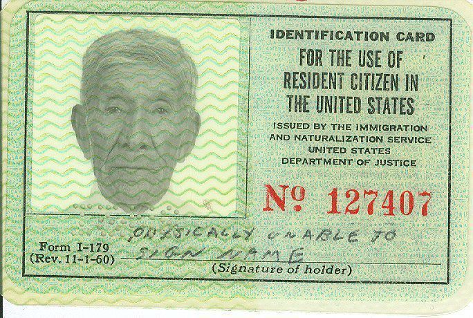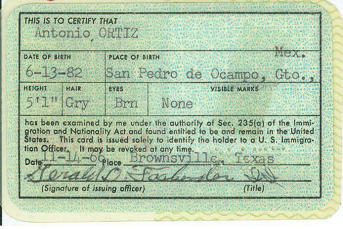 An identification card issued by the Immigration and Naturalization Service of the United States Department of Justice to Antonio Ortiz. The card has a head shot photo of Antonio Ortiz on the left, and his I.D. number printed in red on the right. The back of the card states that "This is to certify that Antonio Oriz... has been found entitled to be and remain in the United States..."Context