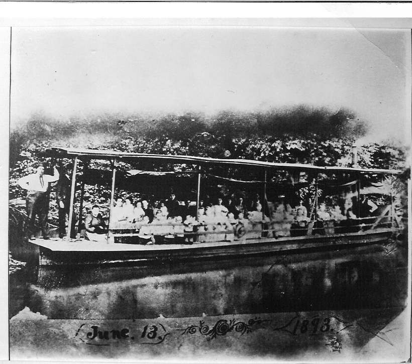 Donation, 07/26/2005. Black and white glossy photographic print in landscape format. This may be a photo of a photo. Image is of a flat-bottom riverboat with roof on poles, crowded with people, docked at a river bank. On back: "Boat rides along Big Blue/River in the gay 90's/Geo. McBride Blue River Boat"Photograph Details