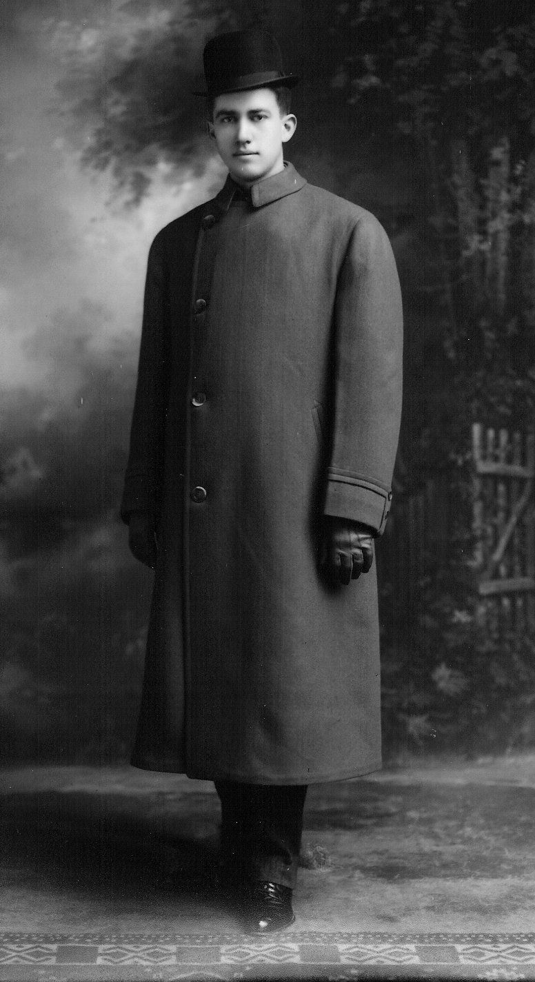 Black and white glass-plate negative in vertical format. Full frontal view of standing man wearing derby hat, top coat and gloves. Original envelope identified the subject as Louis Root. Print made 2/2004. ********* See also: 80.39.42, 86.1.109, 86.1.129, 86.1.144.Collection