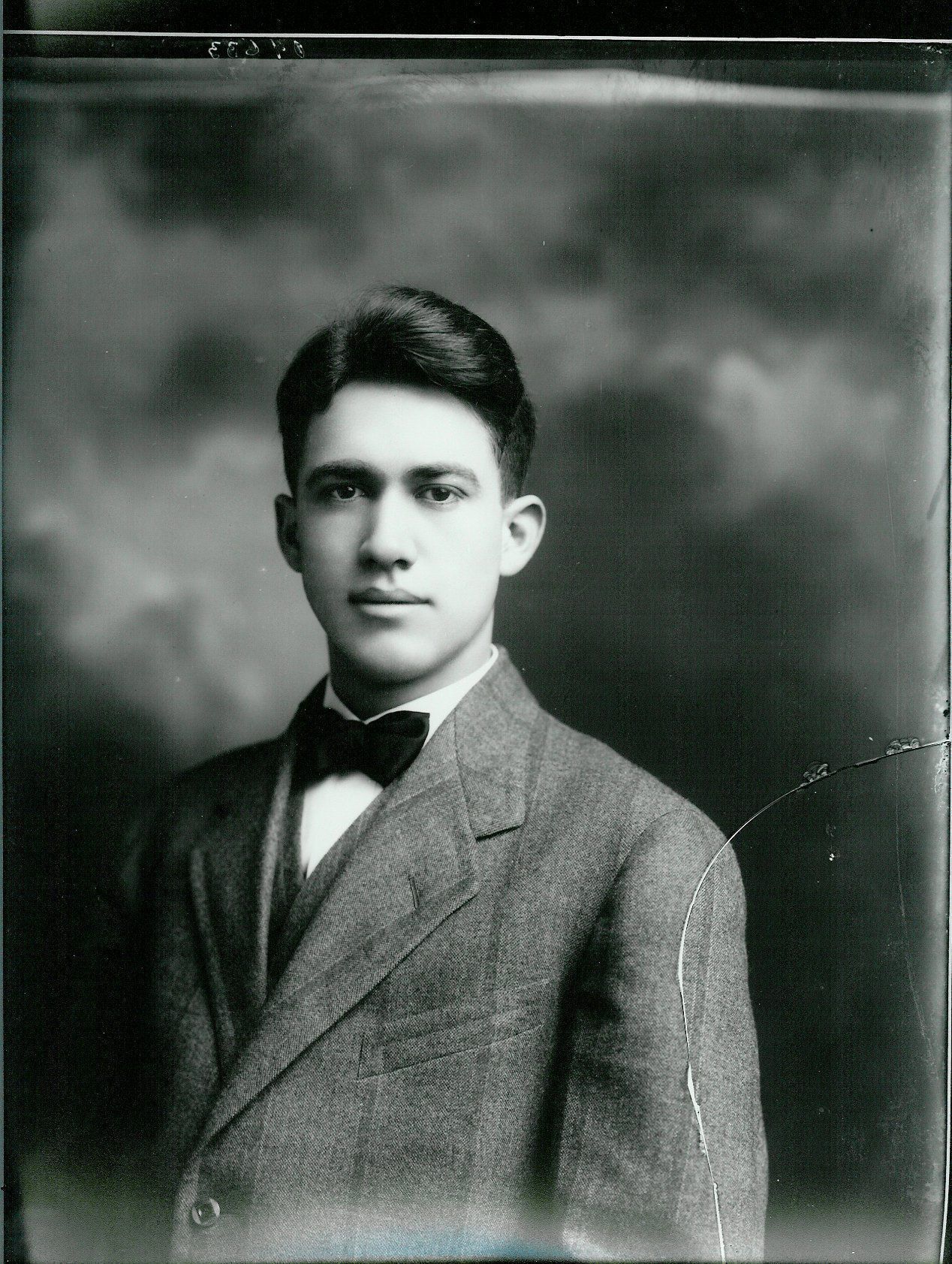 AB: Black and white photographic print in portrait format of a young man, hair parted on right side, cut close above ears, 3-piece suit, prominent breast pocket on left side, top two buttons of coat visible, bow tie. Original envelope was inscribed LOUIS ROOT. Print has been made from this neg. Glass-plate is broken, pieces are marked A & B. *****See also: 80.39.41, 80.39.42, 86.1.109, 86.1.129Collection